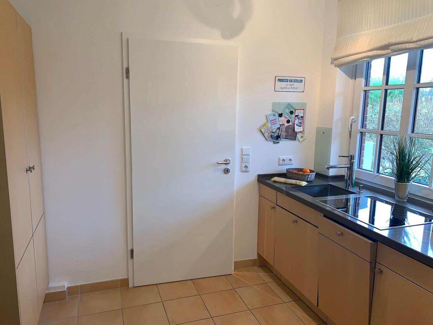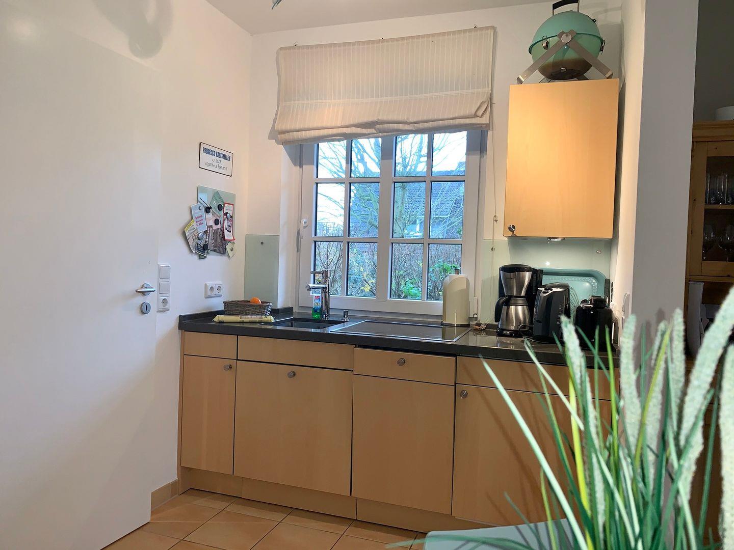 Die angrenzende, offene Küche ist modern und vollumfassend ausgestattet. Neben großem Cerankochfeld sowie Kühlschrank mit Gefrierfach gehören hier Geschirrspüler und Kaffeemaschine zur Ausstattung. Die Wohnung ist zusätzlich mit Insektenschutzgittern im Schlafzimmer und an der Terassentür ausgestattet.