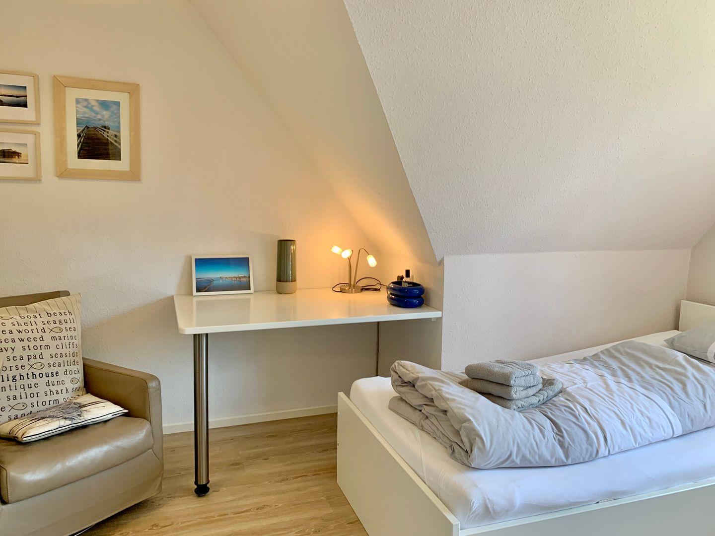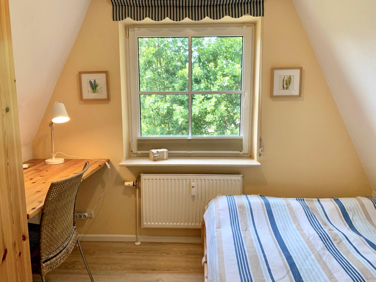 In der 1. Etage befinden sich die zwei Schlafzimmer der Ferienwohnung. Eines verfügt über ein 140x200cm Doppelbett, das Zweite über zwei Einzelbetten.