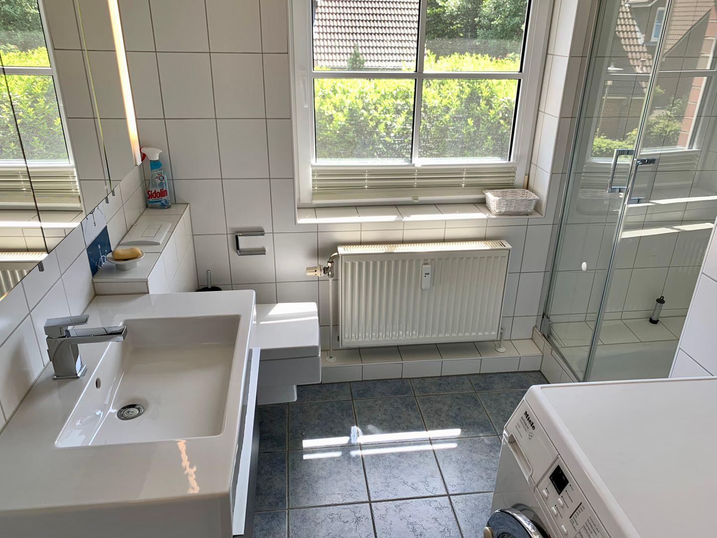 Auf der Etage sind Duschbad und WC vorhanden, dort steht zudem eine Waschmaschine bereit.