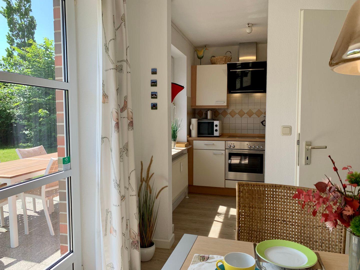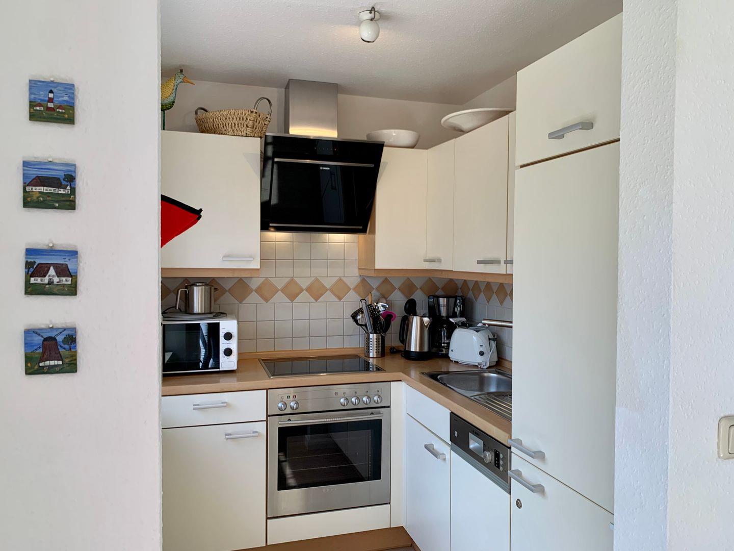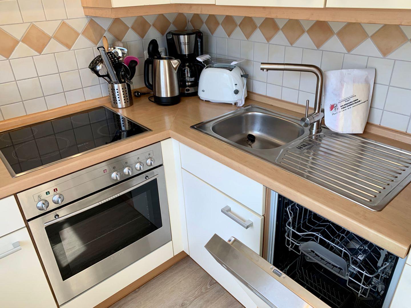 Die angrenzende moderne Küche ist vollumfänglich ausgestattet und verfügt unter anderem über Cerankochfeld und Backofen sowie Kühlschrank mit Gefrierfach, einen Geschirrspüler, sowie eine Kaffeemaschine.