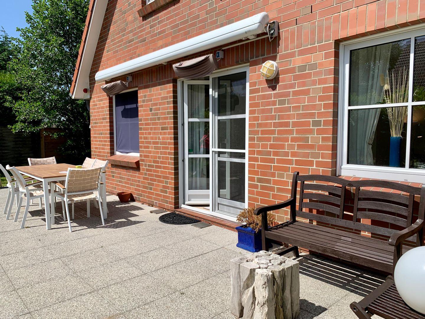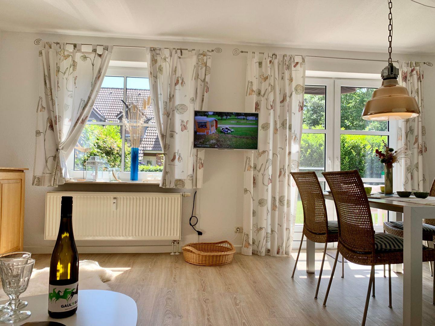 Kostenfreies W-LAN ist vorhanden. Von dort führt die Terrassentür auf die möblierte Terrasse mit Markise und den 300m² großen Garten.