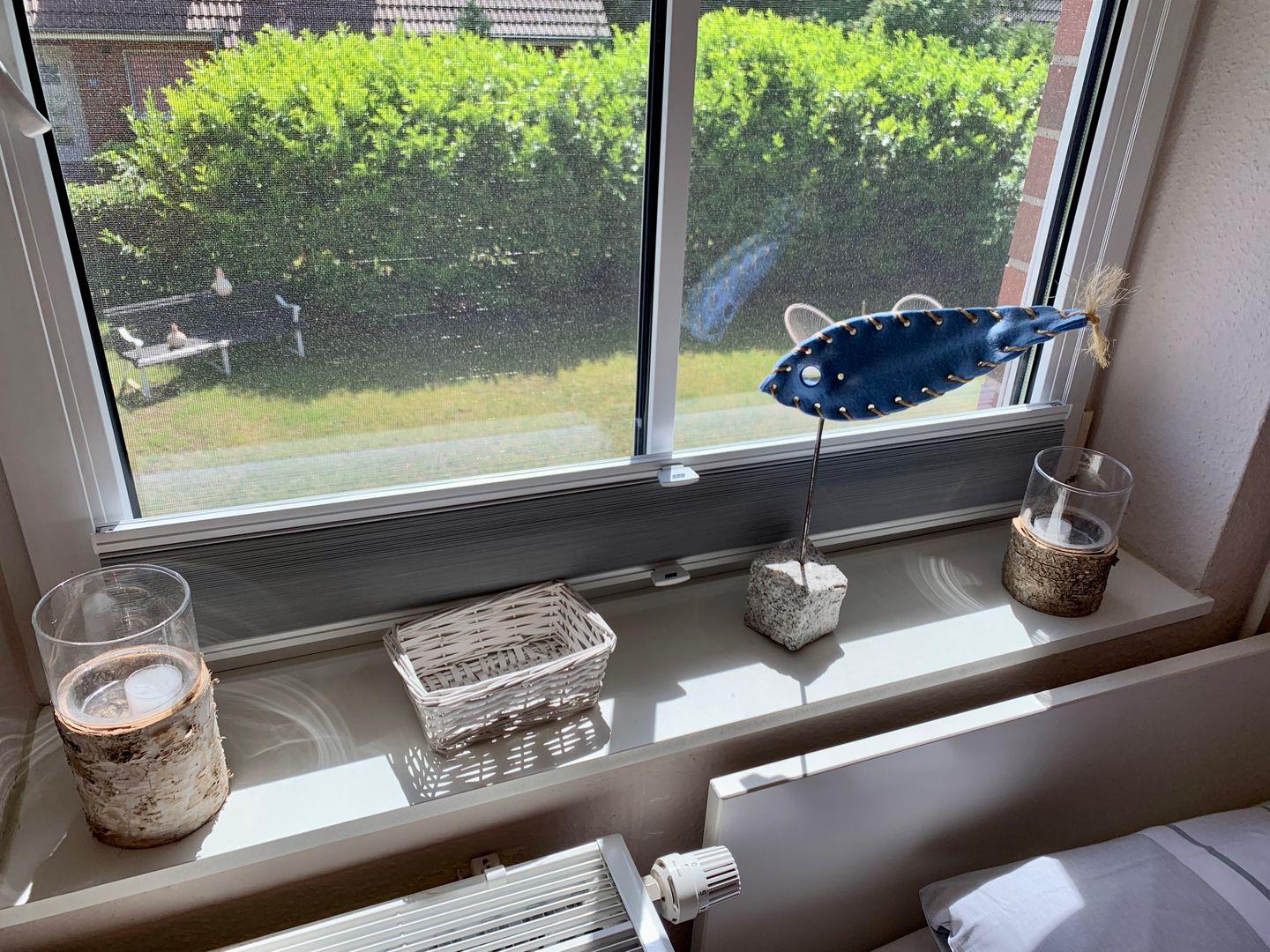 Zusätzlich sind an jedem Fenster sowie den Türen zur Terrasse (je nachdem welche Tür offen/geöffnet ist) ein Mückenschutz angebracht.