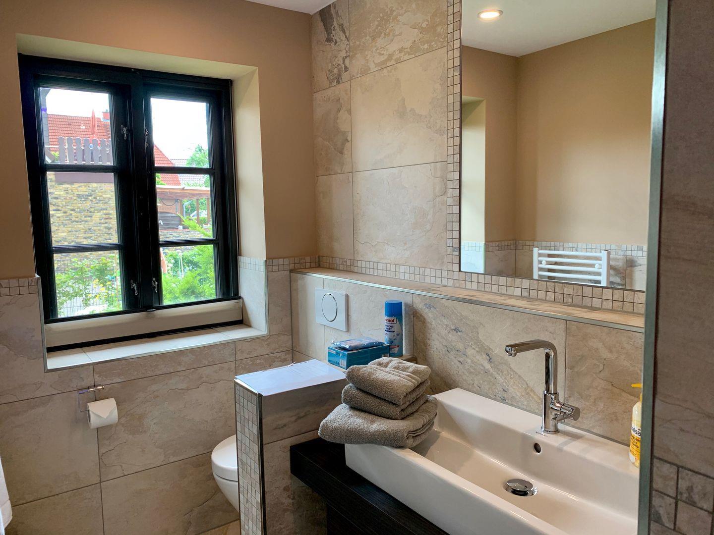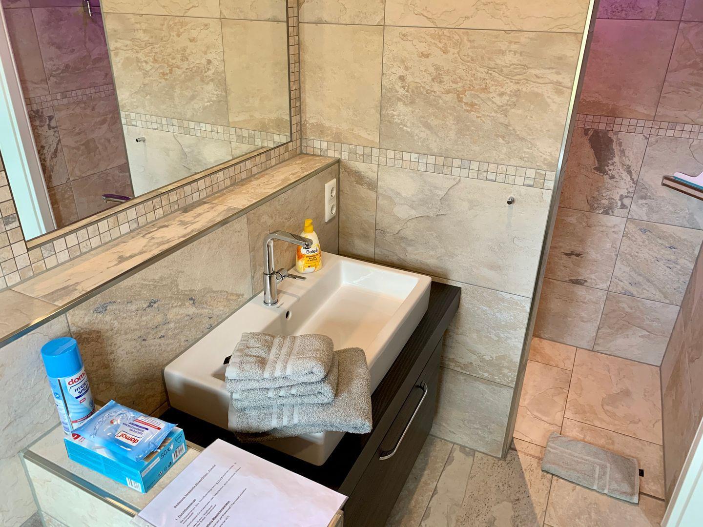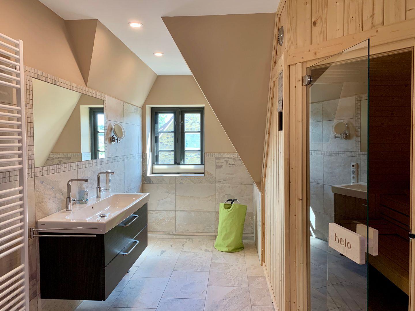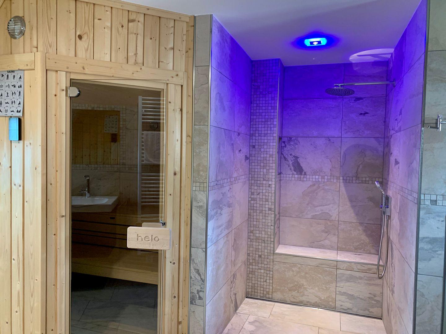 Das hochmoderne Designerbad begeistert mit einzigartiger Optik und sorgt für Spa-Feeling. Neben der bodengleichen Regendusche sind ein Handtuchtrockner und eine edle, holzgetäfelte Sauna vorhanden. Entspannung pur.