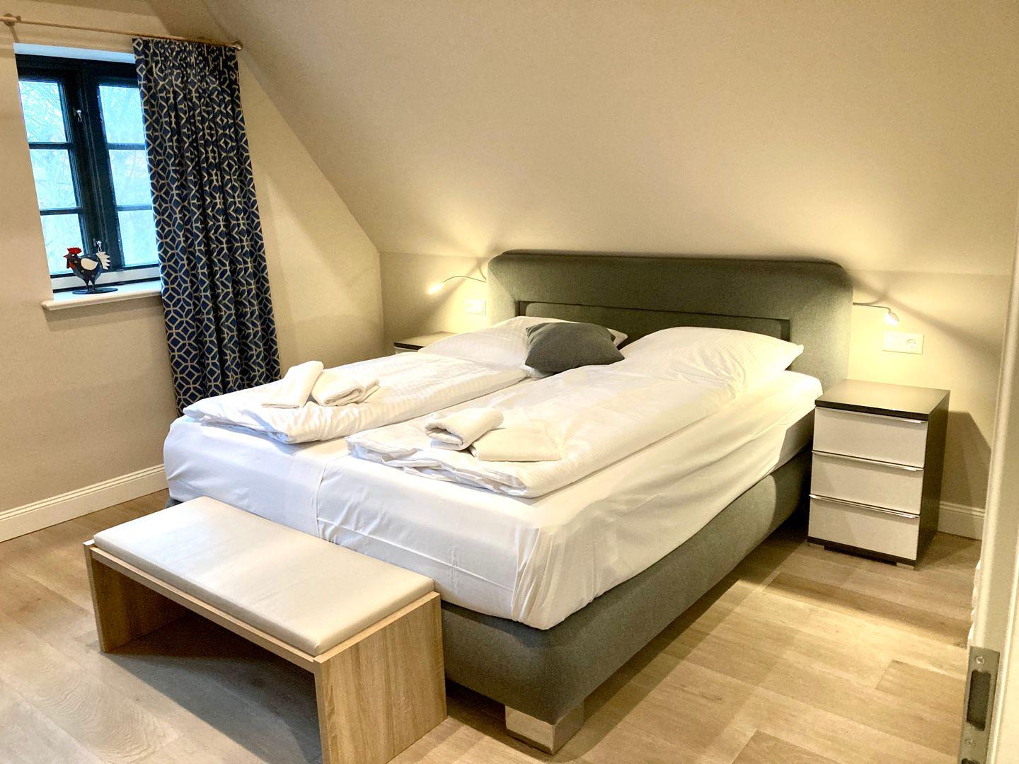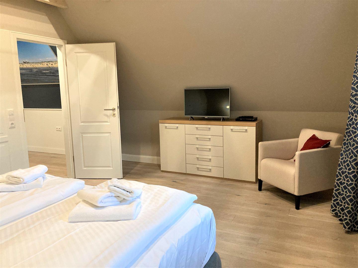 Zum großen Schlafzimmer gehört ein sehr komfortables 180x200cm Boxspringbett mit durchgängigem Topper, weiterhin stehen hier eine Bettbank, ein sehr komfortabler Sessel sowie ein Flachbild-TV zur Verfügung.