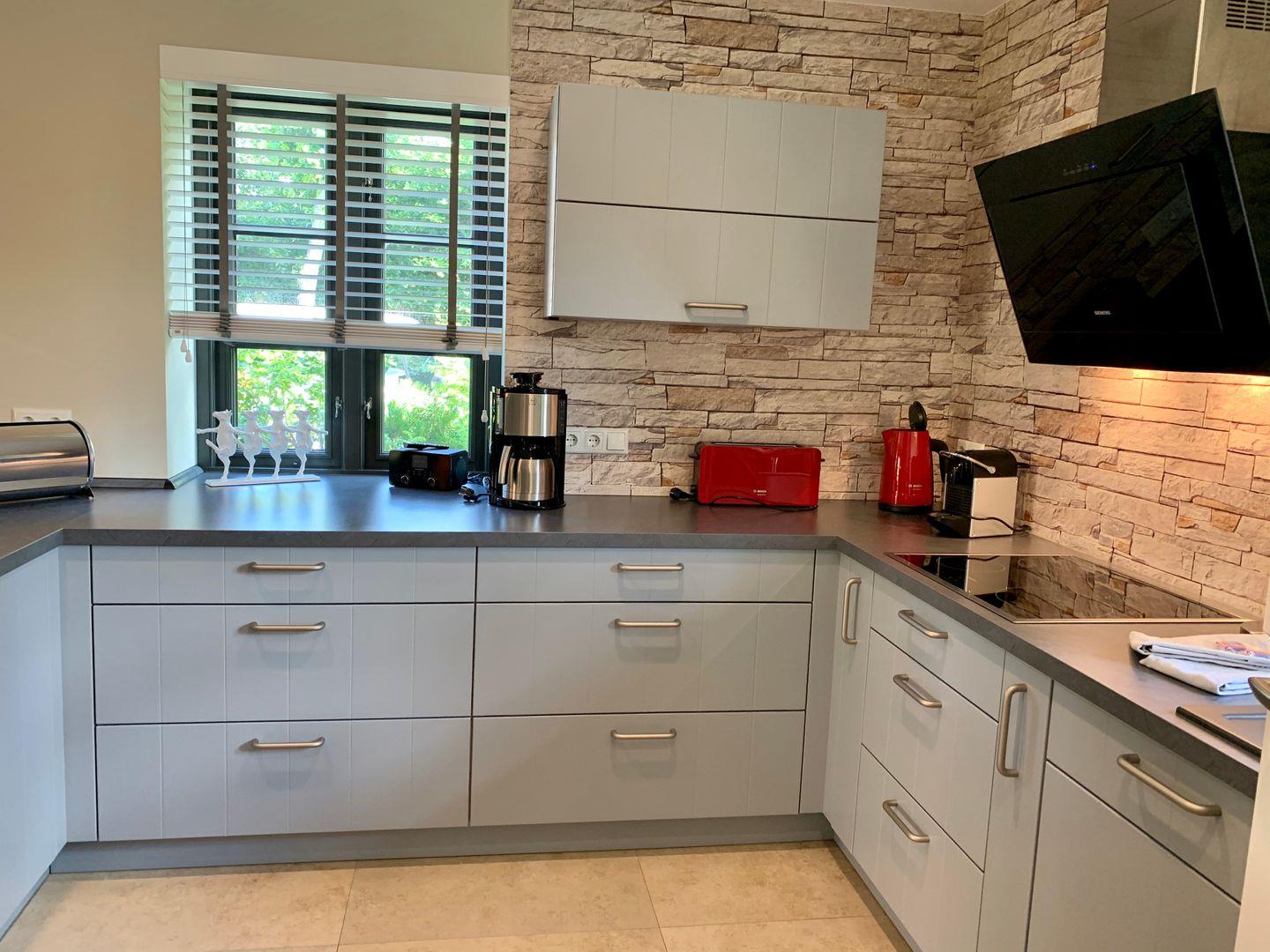 Unter anderem stehen Cerankochfeld und Backofen, ein großer Kühlschrank mit Geschirrspüler sowie zwei Kaffeemaschinen zur Verfügung – eine für klassischen Filterkaffee, eine weitere für Kaffeepads.