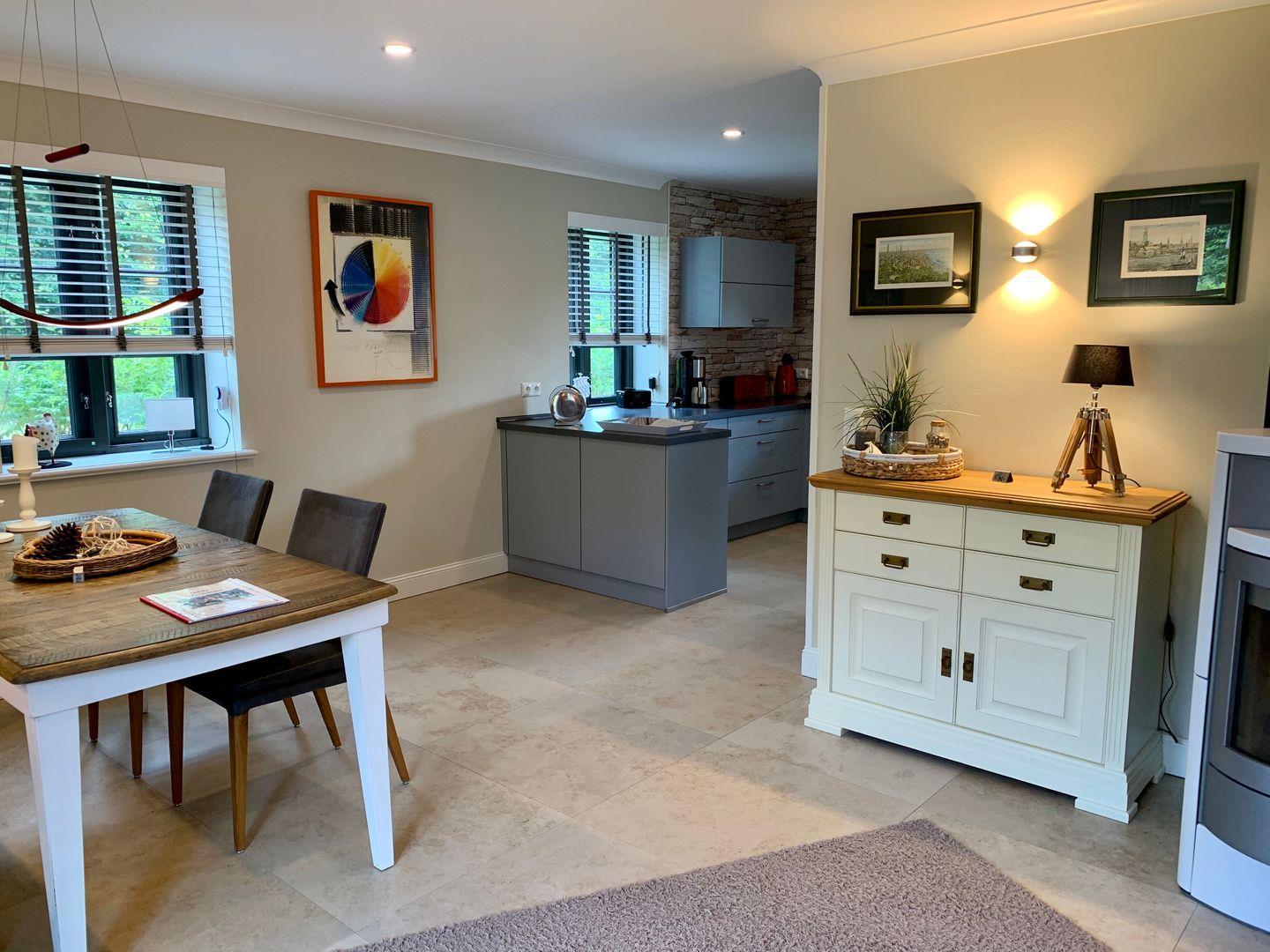 Anspruchsvoller Wohnraum mit Kaminofen und angrenzender, offener Küche. Ein Schlafzimmer mit Doppelbett, ein Schlafzimmer mit Einzelbett.