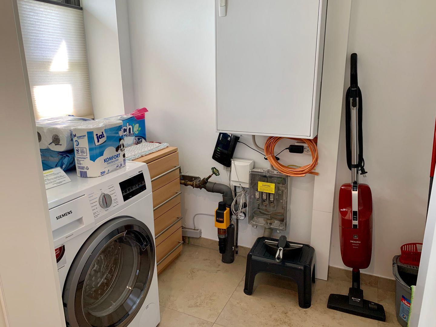 Ein Badezimmer mit bodengleicher Regendusche, WC und Handtuchtrockner gehört ebenfalls zum Erdgeschoss. Im Hauswirtschaftsraum stehen Waschmaschine und Trockner bereit.