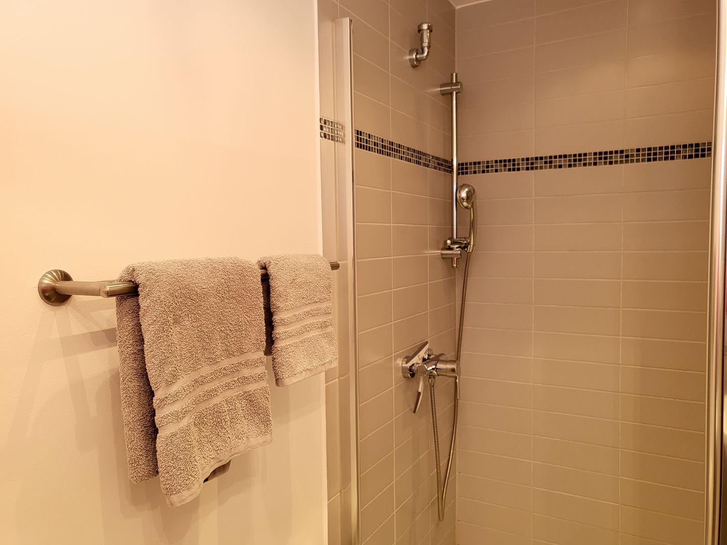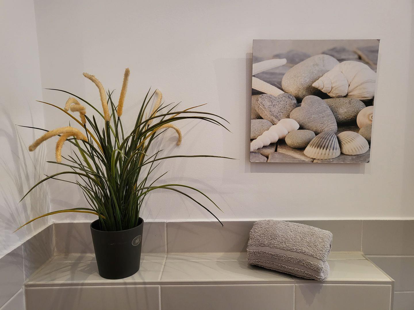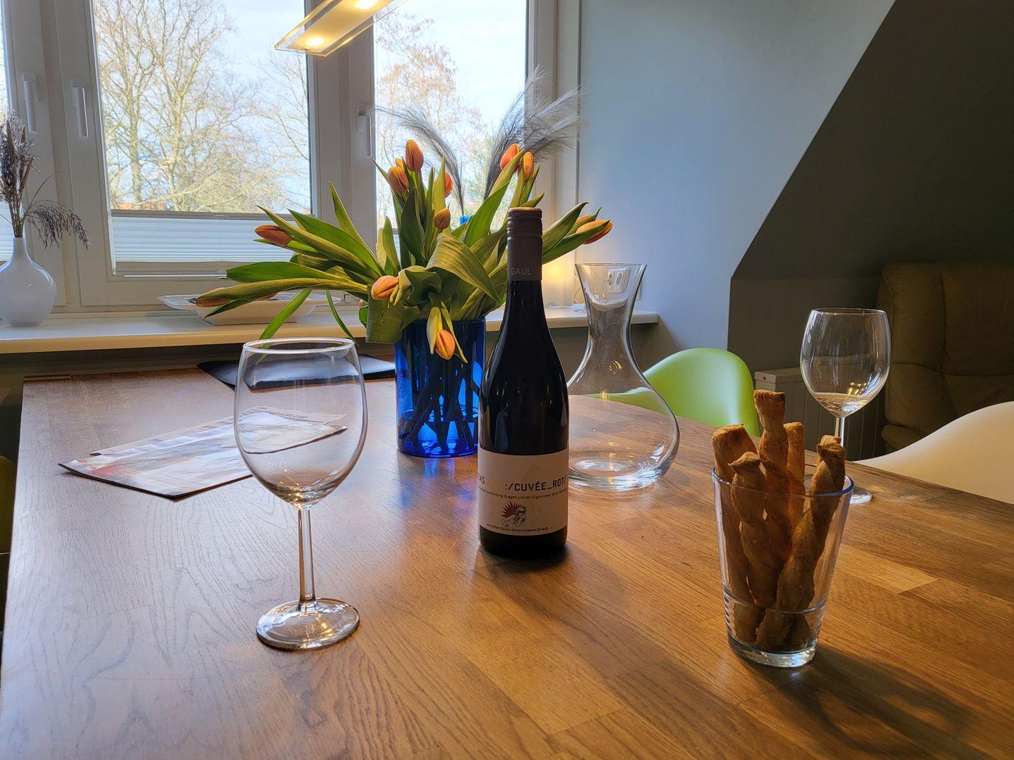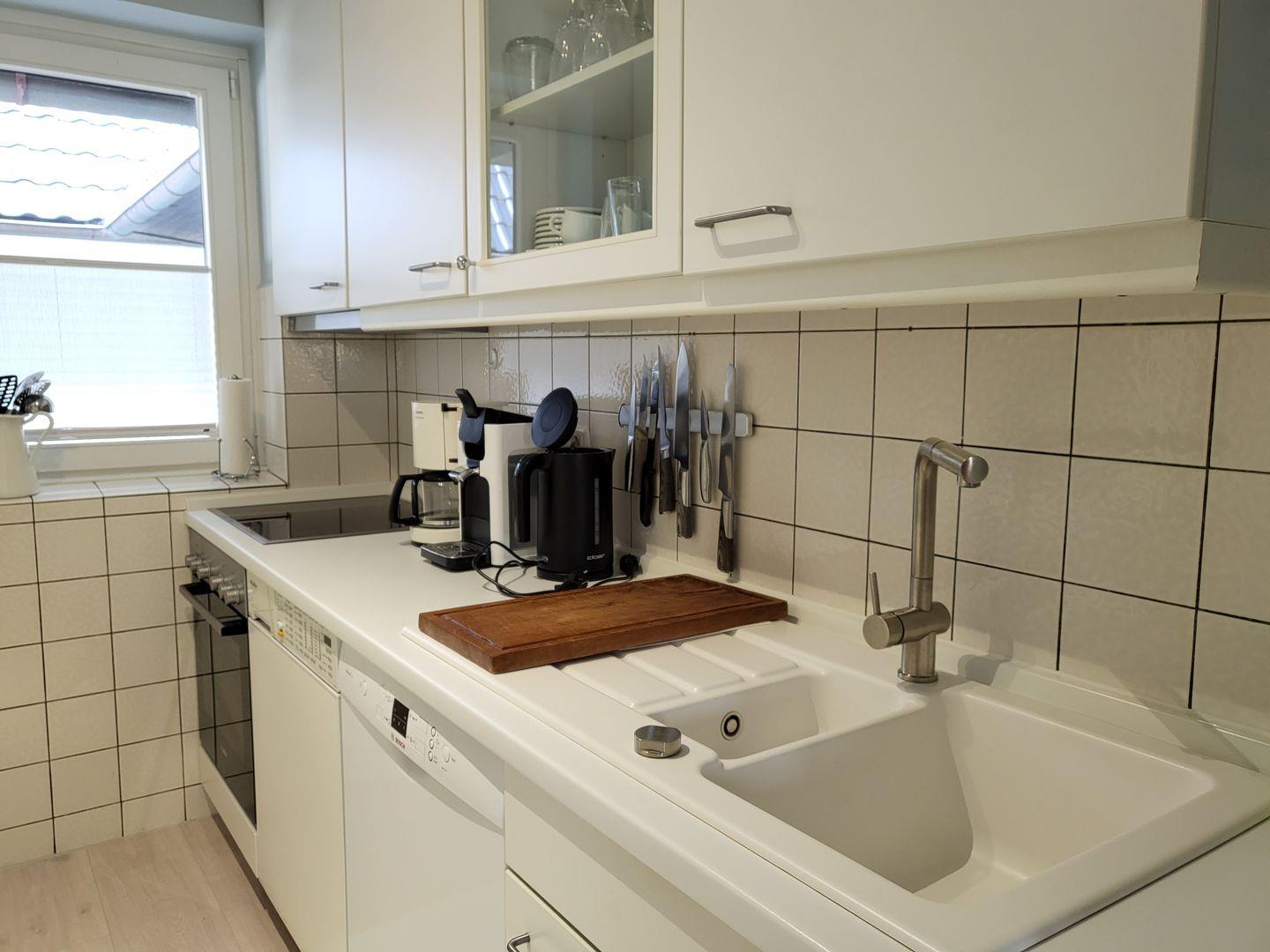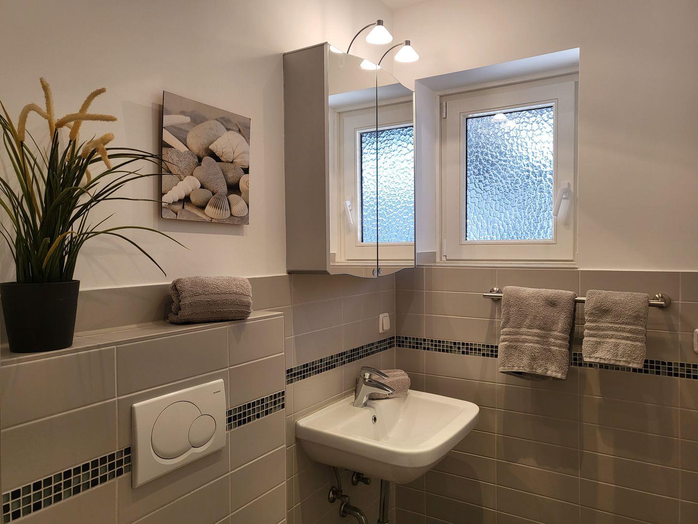 Ein Geschirrspüler gehört ebenfalls zur Ausstattung. Zur Ferienwohnung gehört ein Duschbad mit WC und Fußbodenheizung.
