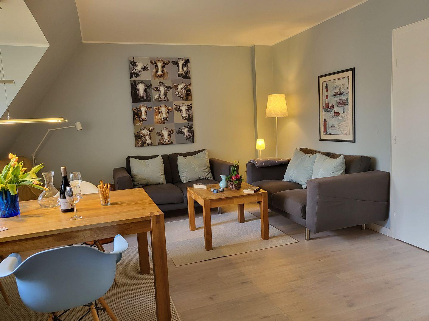 Der Wohnraum ist eingerichtet mit einer gemütlichen Sitzecke, Esstisch für 4 Personen sowie Flachbild-TV und Musikanlage. Kostenfreies W-LAN ist vorhanden.