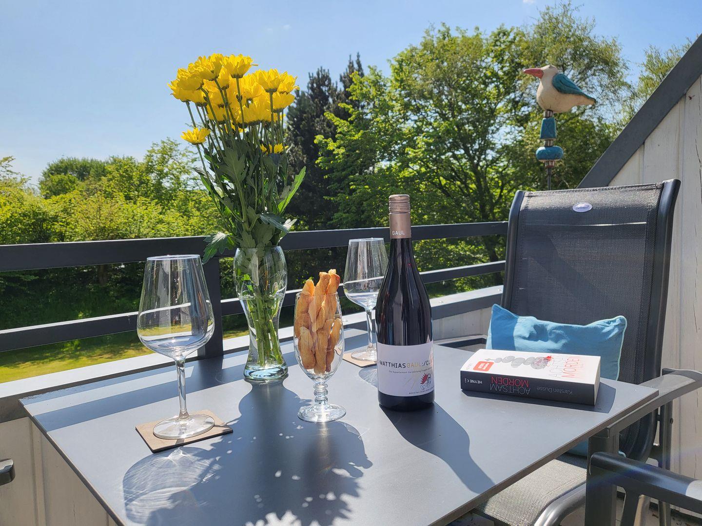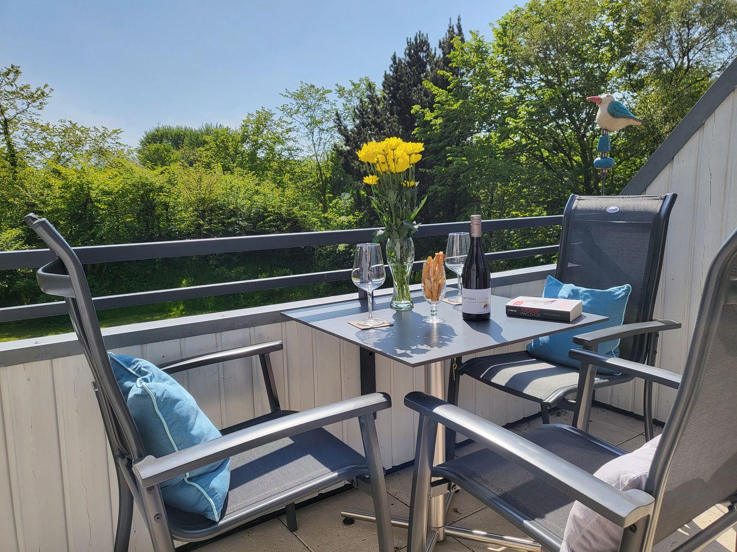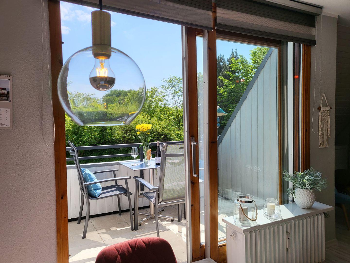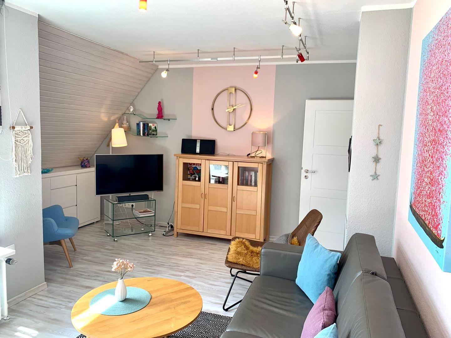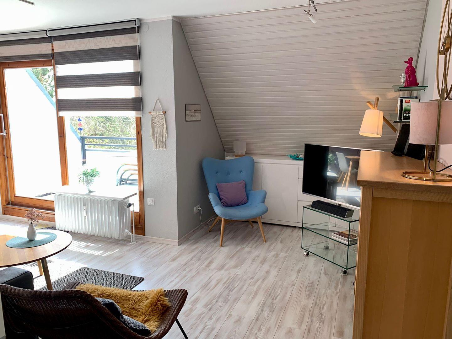 Moderne 2-Zimmer Ferienwohung mit Balkon in Südwestlage. Kombinierter Wohn-Schlafraum mit Schlafcouch, ein