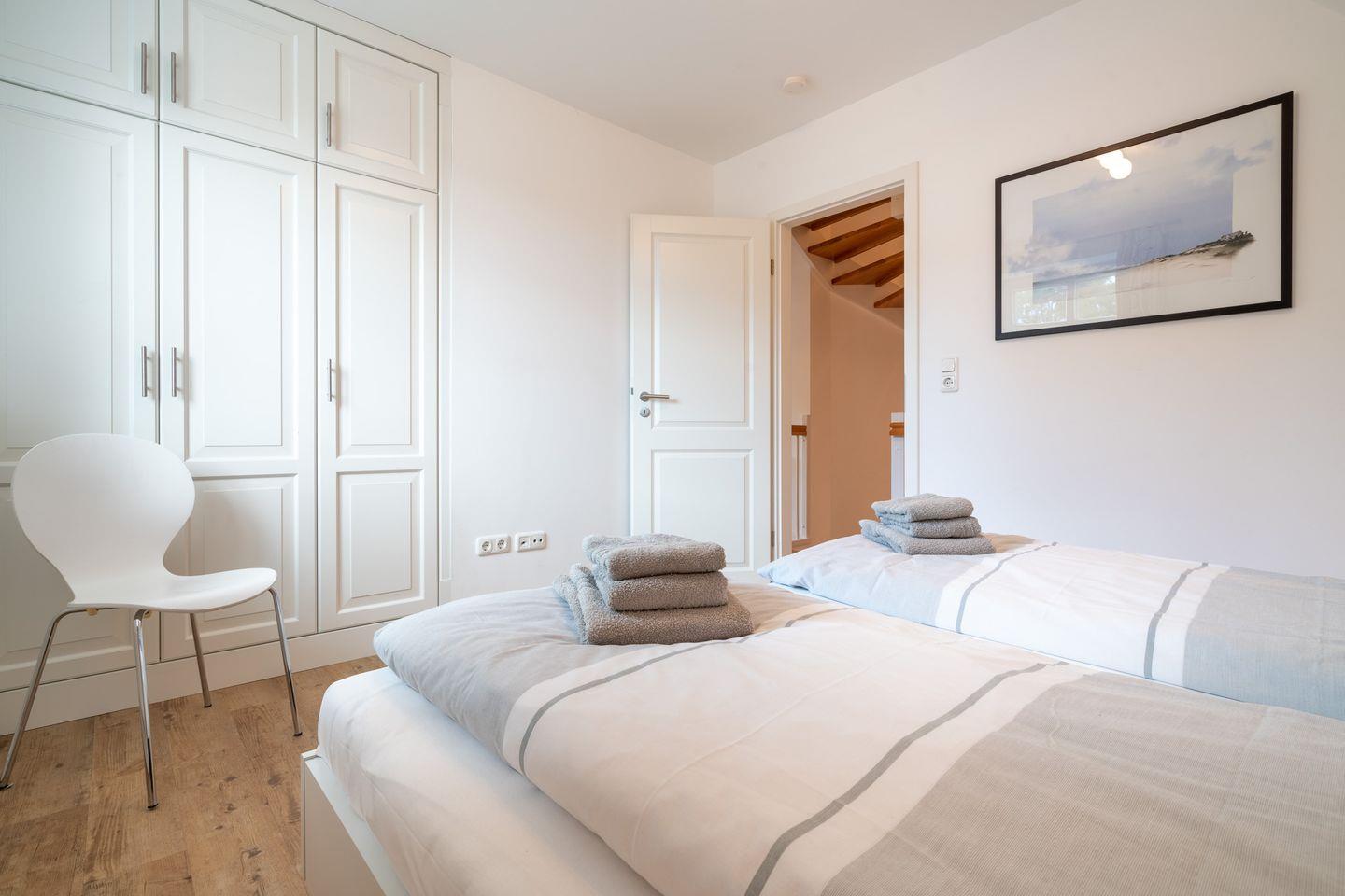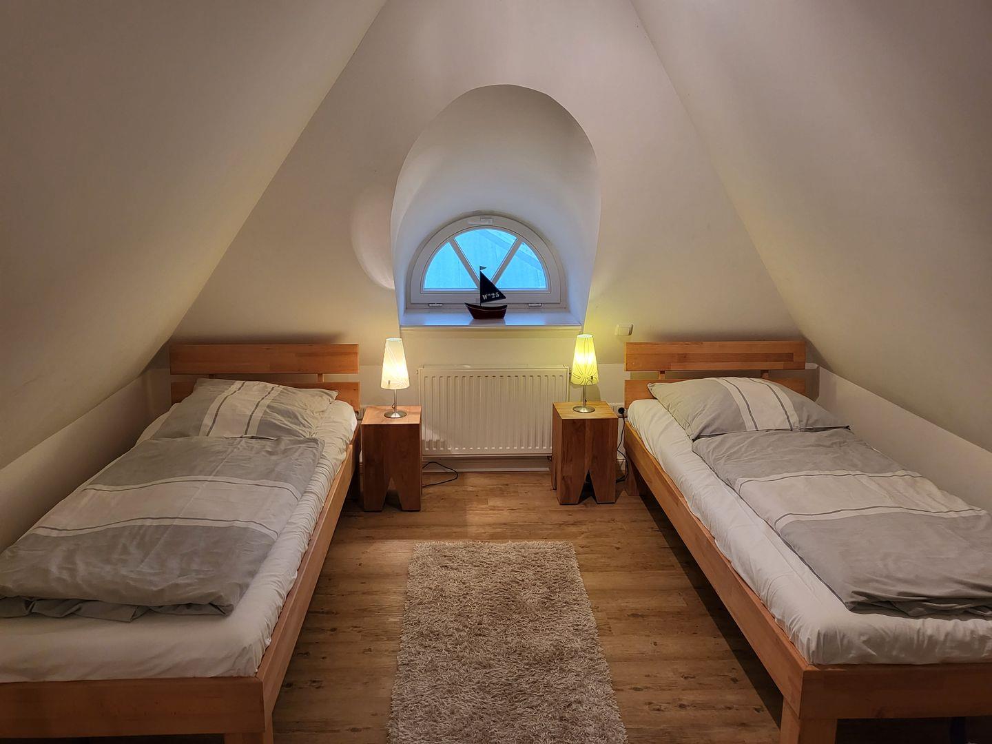 Im offenen Dachgeschoss stehen zwei Einzelbetten. Der Raum ist offen zum Treppenbereich.