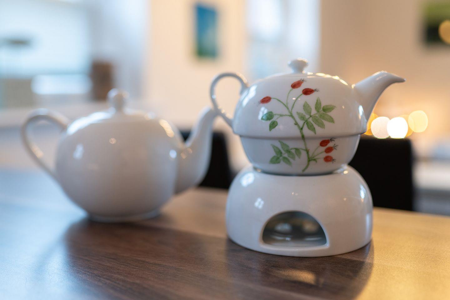 Zur Ausstattung gehört hier eine sehr komfortable Sitzgarnitur mit einem Sofa und zwei Sesseln mit Fußhockern. Am edlen Esstisch ist Platz für die gesamte Familie.