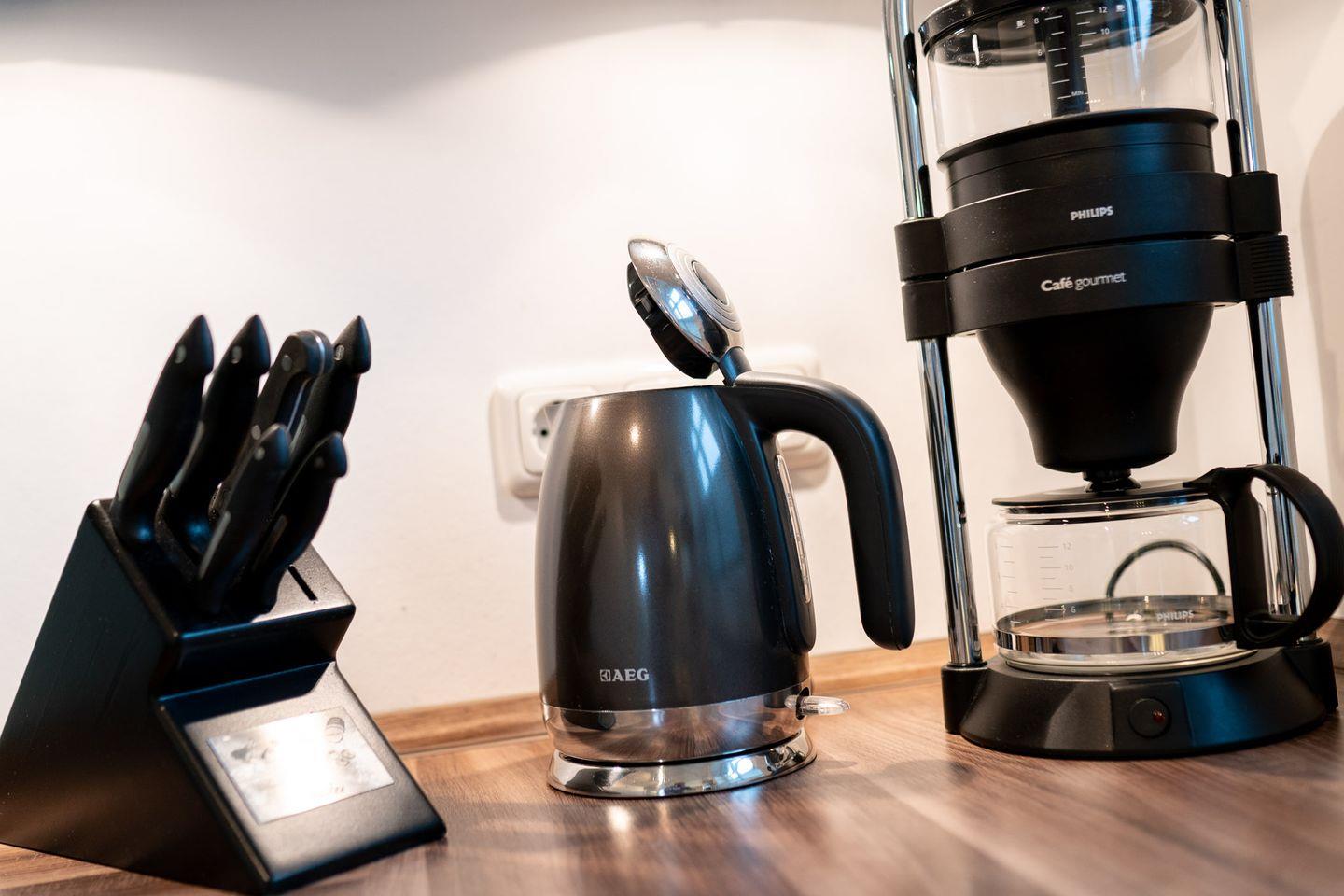 Perfekt in den Raum integriert liegt die vollumfassend ausgestattete Küche, zu deren Ausstattung unter anderem Induktionskochfeld und Backofen, ein Kühlschrank mit Gefrierfach sowie Geschirrspüler und Kaffeemaschine gehören.