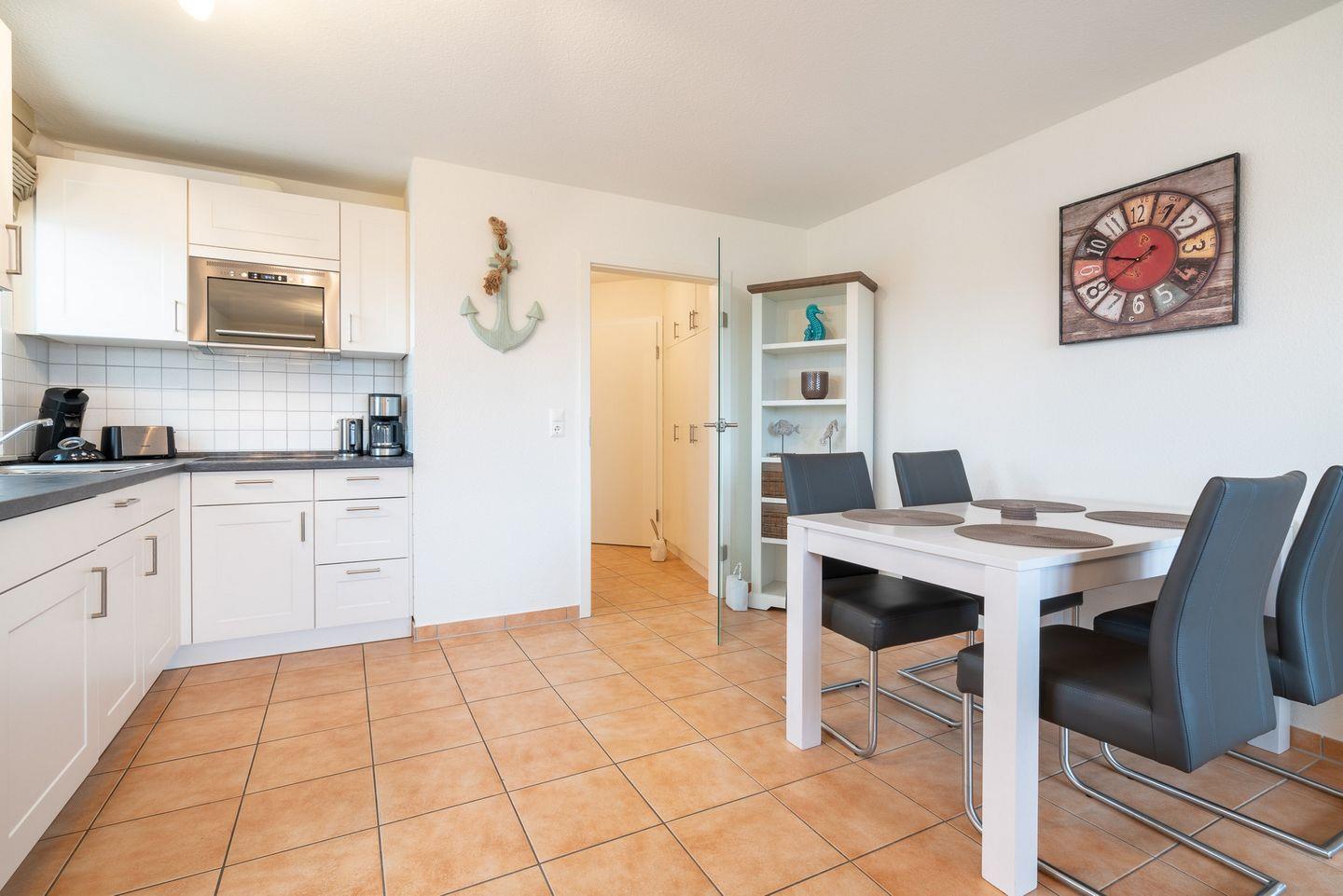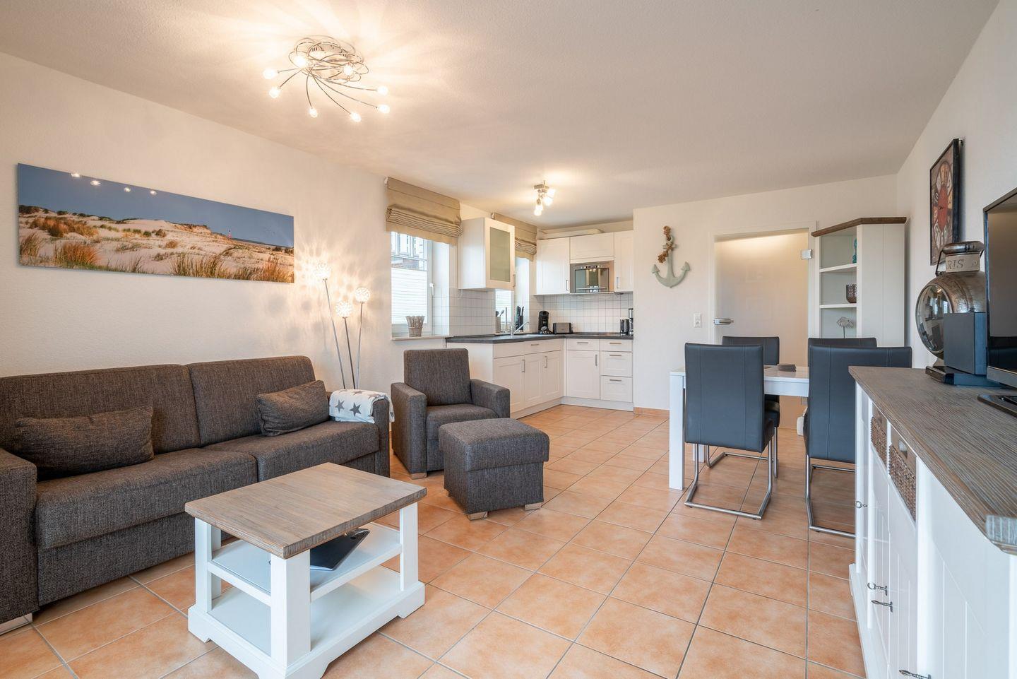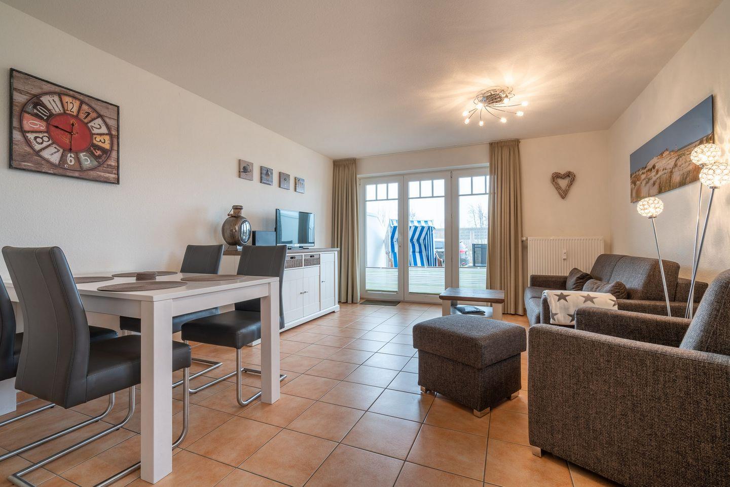 Moderne 2- Zimmer-Wohnung für 2 Personen im EG mit Terrasse und Strandkorb. Heller Wohnraum mit Sitz- und Essecke, offene
