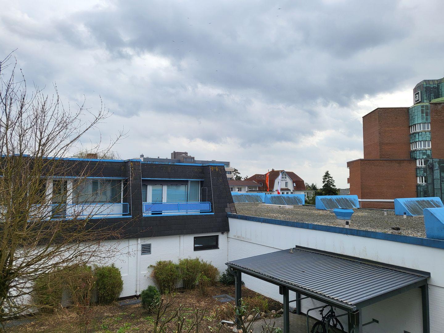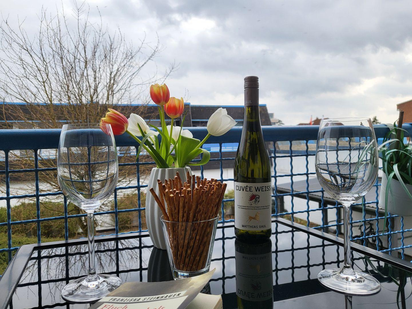 Ein kleiner Balkon zur ruhigen Gartenseite mit Blick in einen sehr schön angelegten Garten schafft mit kleinem Tisch und zwei Stühlen Raum zum Abschalten und Entspannen.
