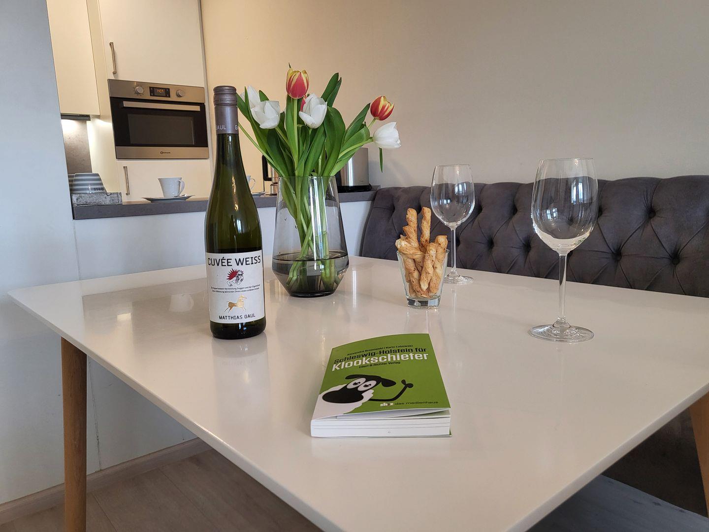 Angrenzend an die Küche befinden sich der Esstisch und eine gemütliche Polstereckbank.