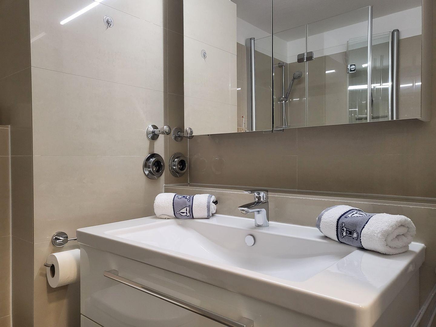 Die Ausstattung beinhaltet darüber hinaus eine moderne Handtuchhalterheizung, Spiegelschrank mit LED-Leuchte, Waschtisch mit Schubladen und ein WC.
