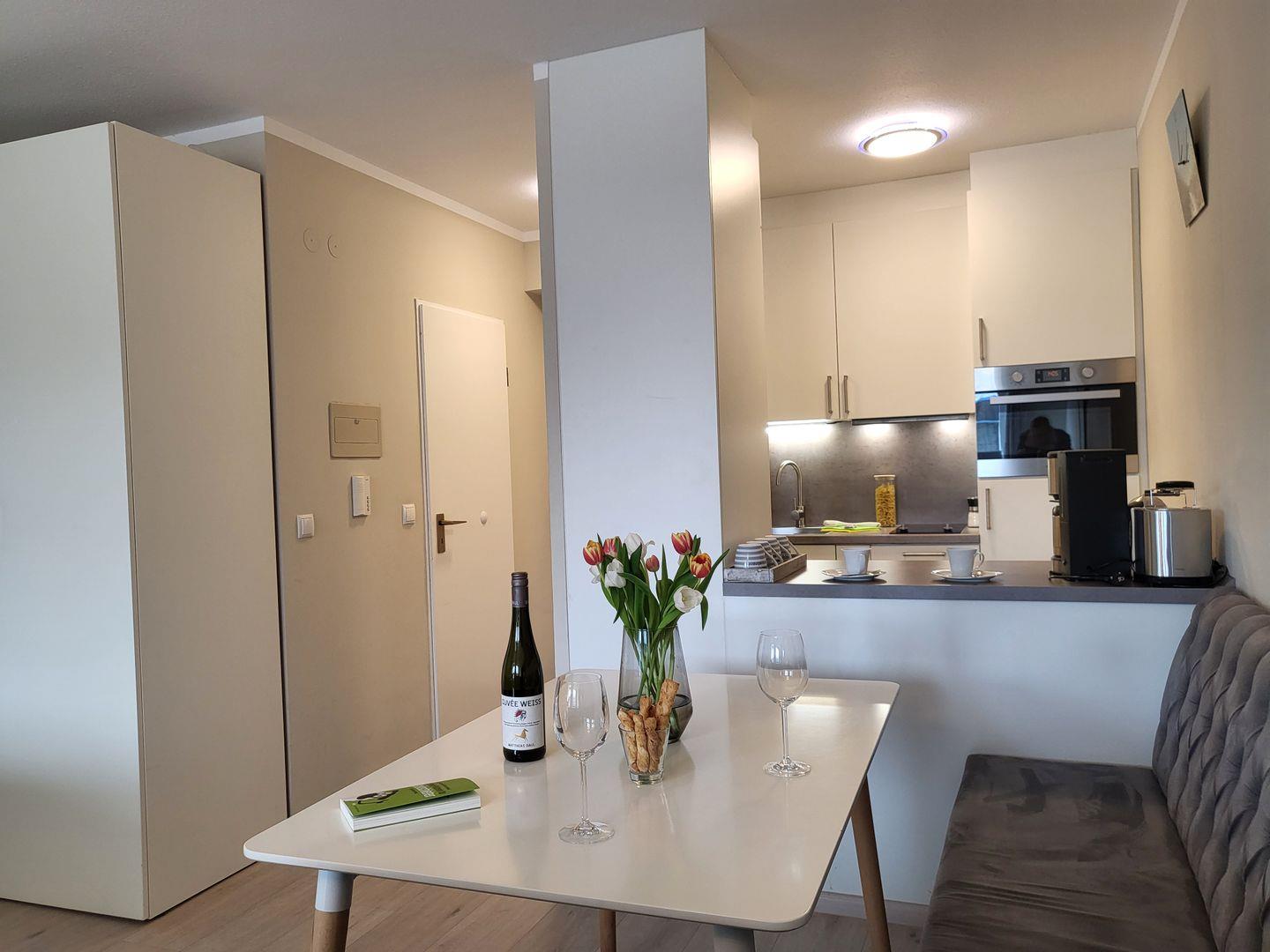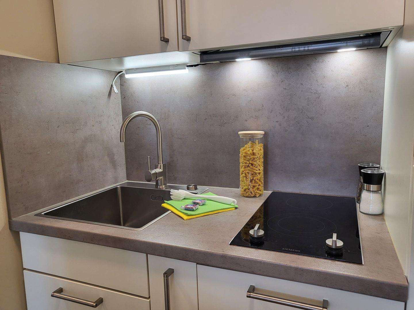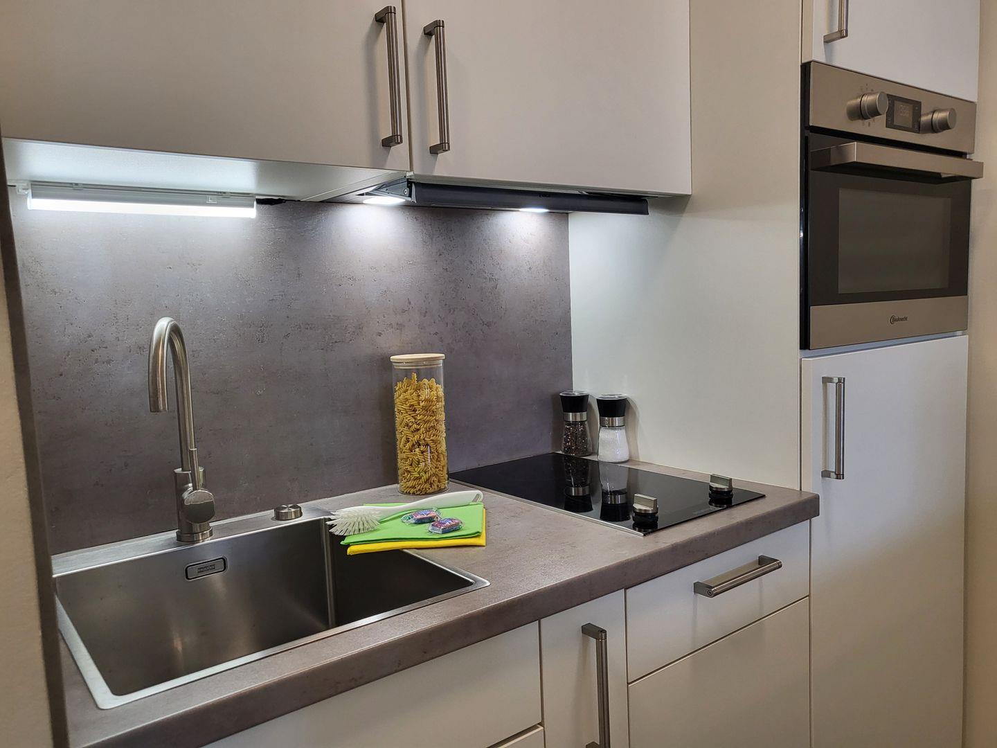 Integriert in den modern eingerichteten Wohnraum liegt die halboffene, sehr gut ausgestattete Küche mit Cerankochfeld und Dunstabzugshaube sowie ein Backofen mit Mikrowellen- und Grillfunktion.