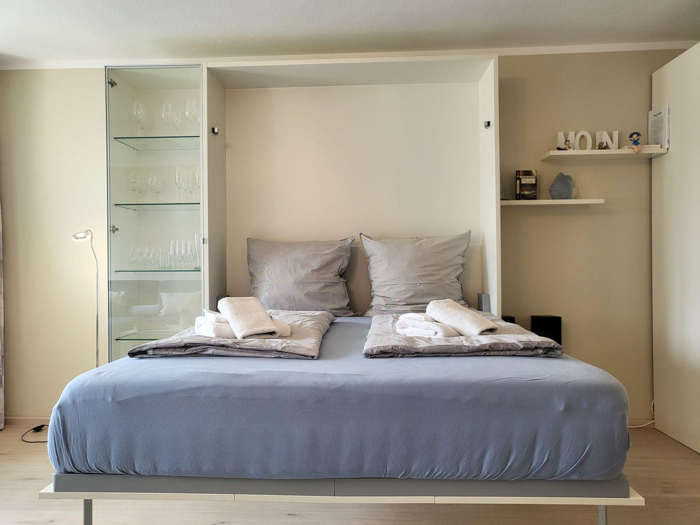Auf der gegenüberliegenden Seite des Raumes steht die moderne Schrankwand mit einem hochwertigen Schrankdoppelbett.