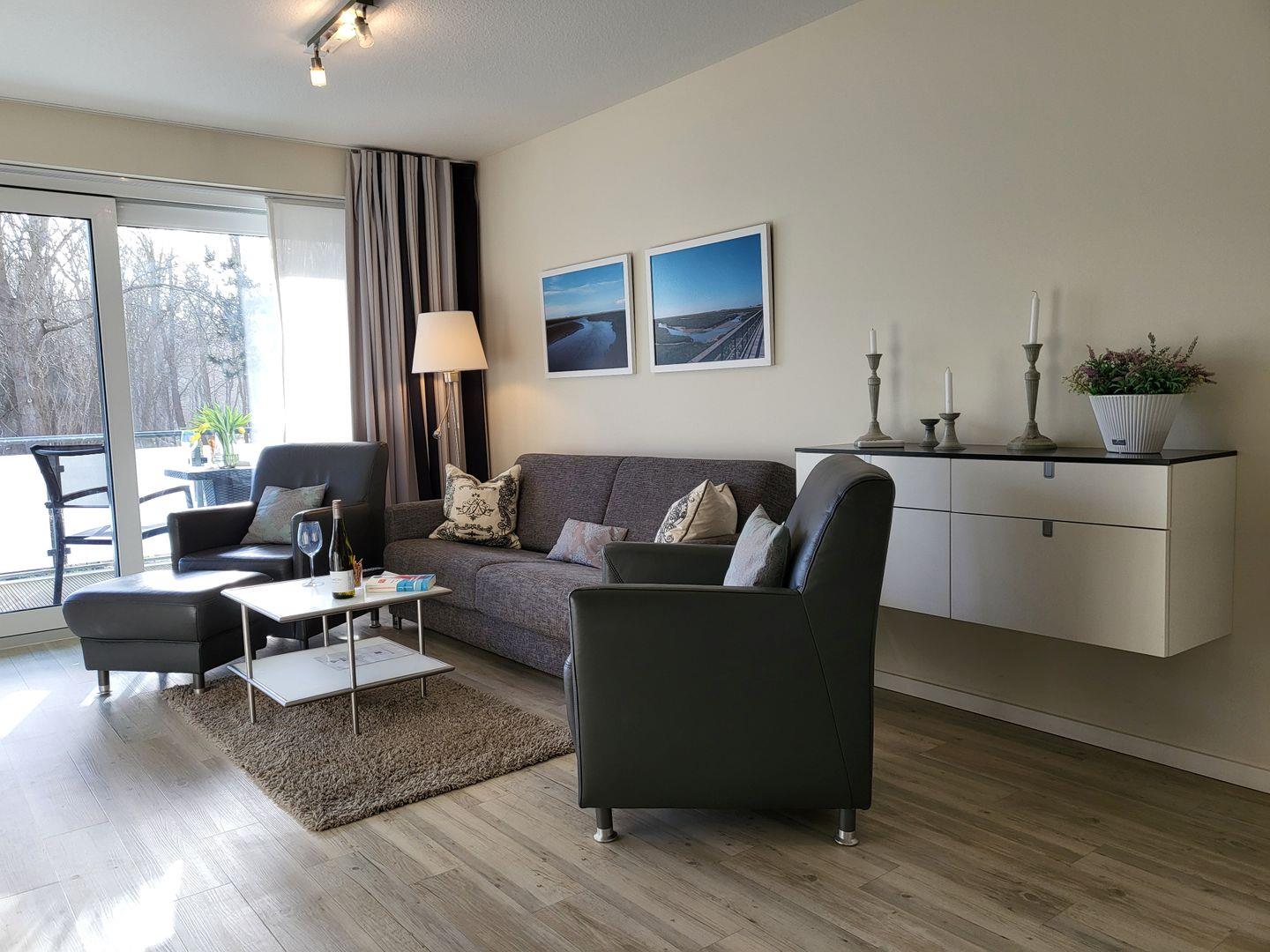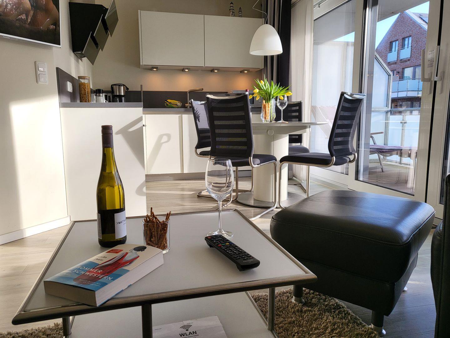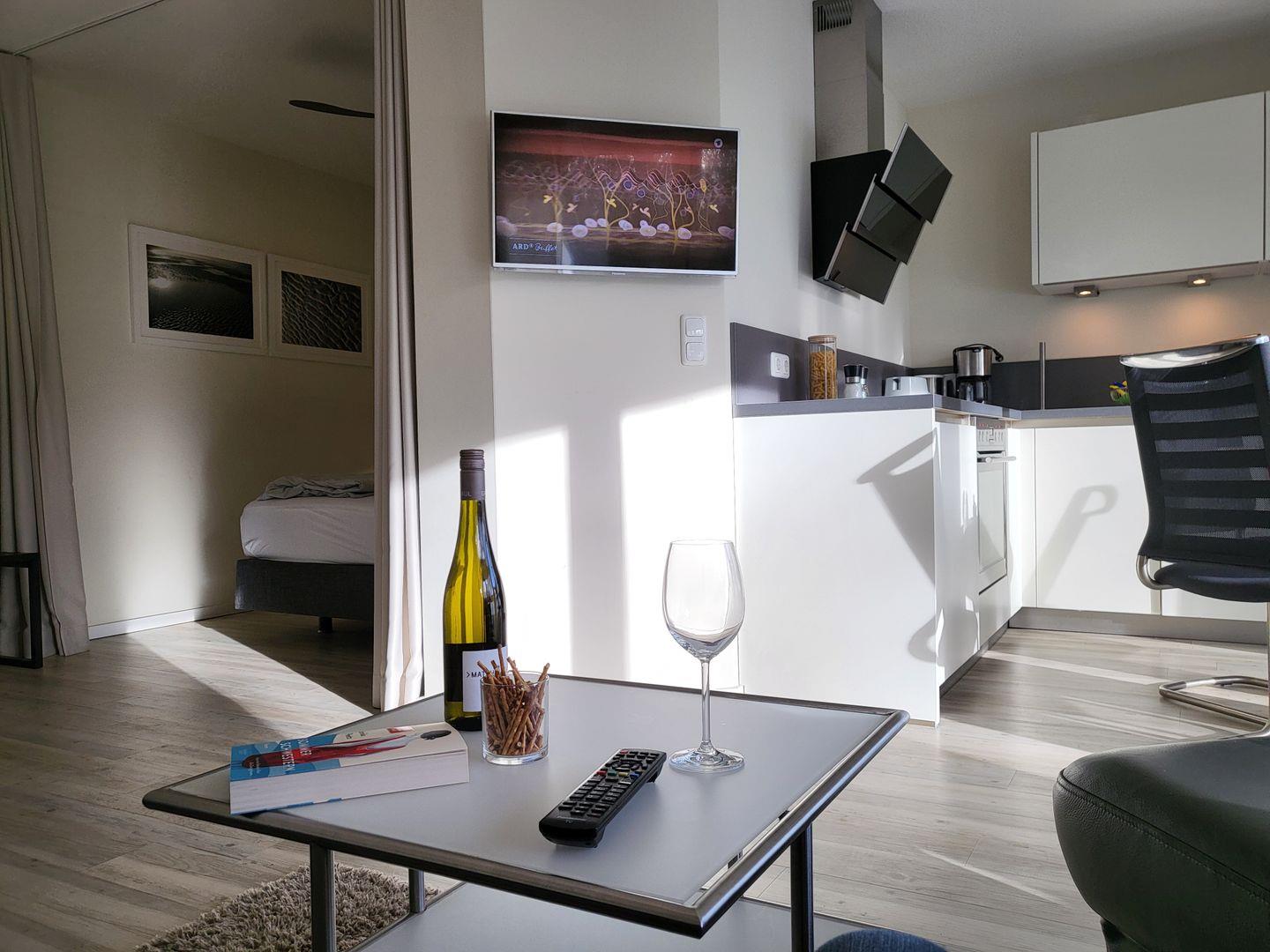 Der kombinierte Wohn- Schlafraum wirkt durch das große Panoramafenster und den Durchgang zum möblierten Balkon wunderbar hell und einladend. Hier stehen ein Sofa und zwei edle Ledersessel zur Verfügung. Für die multimediale Unterhaltung sorgen ein großer Flachbild-TV und kostenfreies W-LAN. Integriert in den Wohnraum ist die kompakte Küche der Ferienwohnung, hier stehen unter anderem Cerankochfeld, Kühlschrank sowie Geschirrspüler und Kaffeemaschine zur Verfügung.