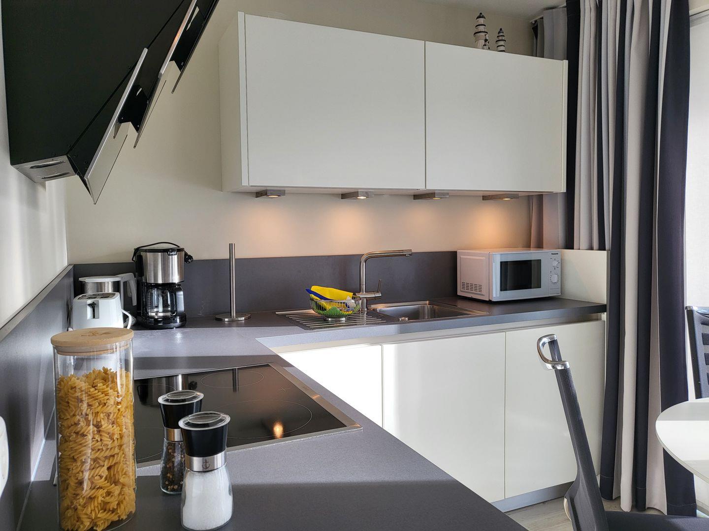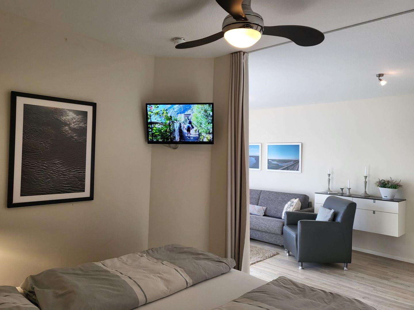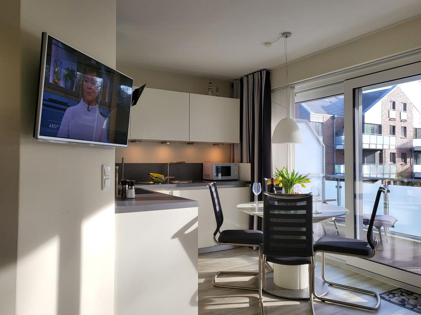 Der kombinierte Wohn- Schlafraum wirkt durch das große Panoramafenster und den Durchgang zum möblierten Balkon wunderbar hell und einladend. Hier stehen ein Sofa und zwei edle Ledersessel zur Verfügung. Für die multimediale Unterhaltung sorgen ein großer Flachbild-TV und kostenfreies W-LAN. Integriert in den Wohnraum ist die kompakte Küche der Ferienwohnung, hier stehen unter anderem Cerankochfeld, Kühlschrank sowie Geschirrspüler und Kaffeemaschine zur Verfügung.
