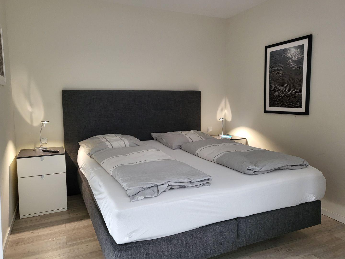 Ebenfalls zum Wohnraum gehört der offene Schlafbereich. Hier sorgt ein Verdunklungsvorhang für ungestörten Schlaf, ein komfortables 180x200cm Boxspringbett steht nebst Flachbild-TV zur Verfügung.