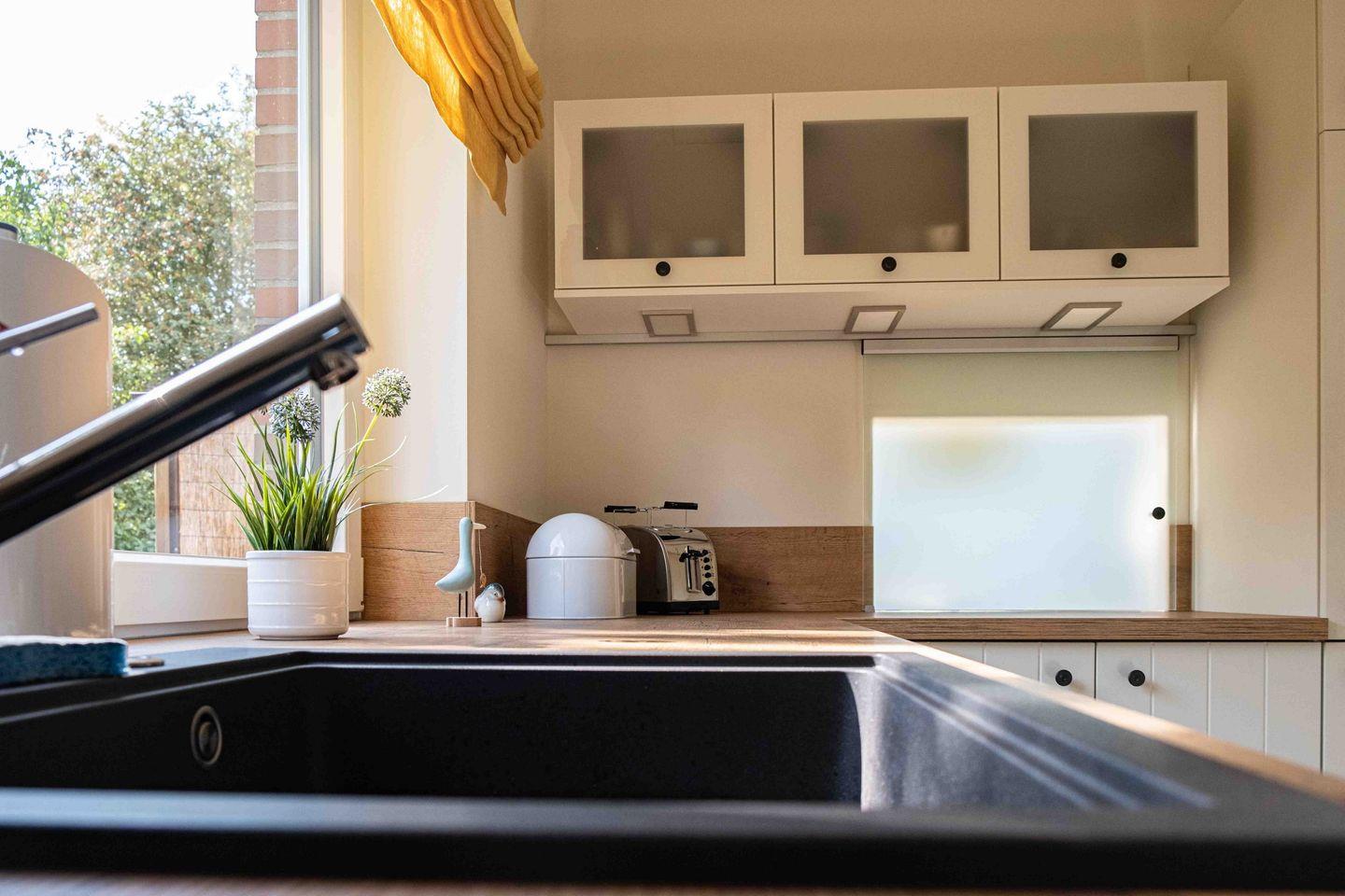 Die via Durchreiche zum Essbereich verbundene Küche ist hochwertig ausgestattet und verfügt über eine Kühl-Gefrier-Kombination sowie Geschirrspüler, Induktionskochfeld und Backofen. Weiterhin stehen Mikrowelle, Toaster und Kaffeemaschine bereit.