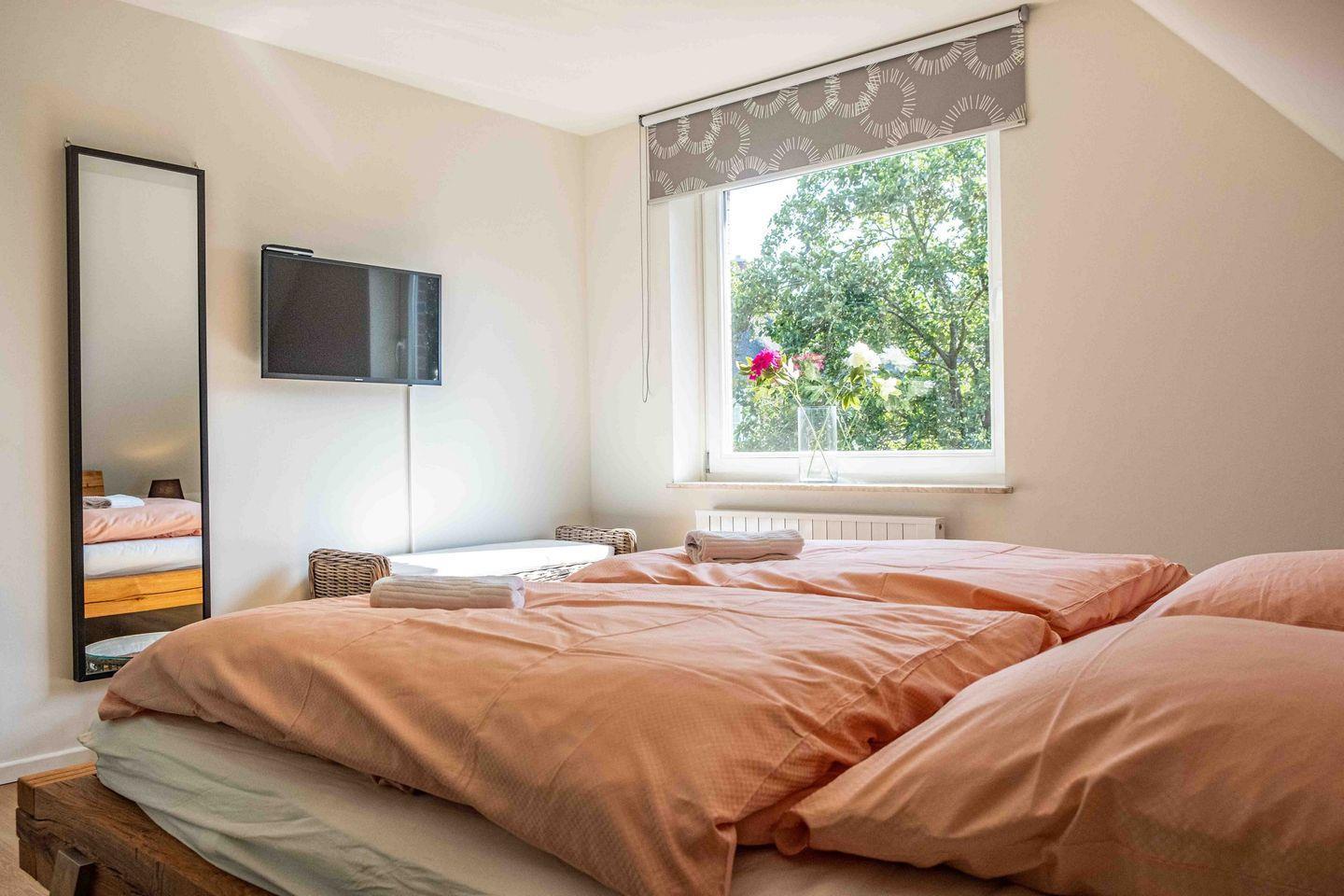 Ein separates Schlafzimmer mit Doppelbett und ein weiteres mit Einzelbett im OG, Duschbad mit WC vorhanden.