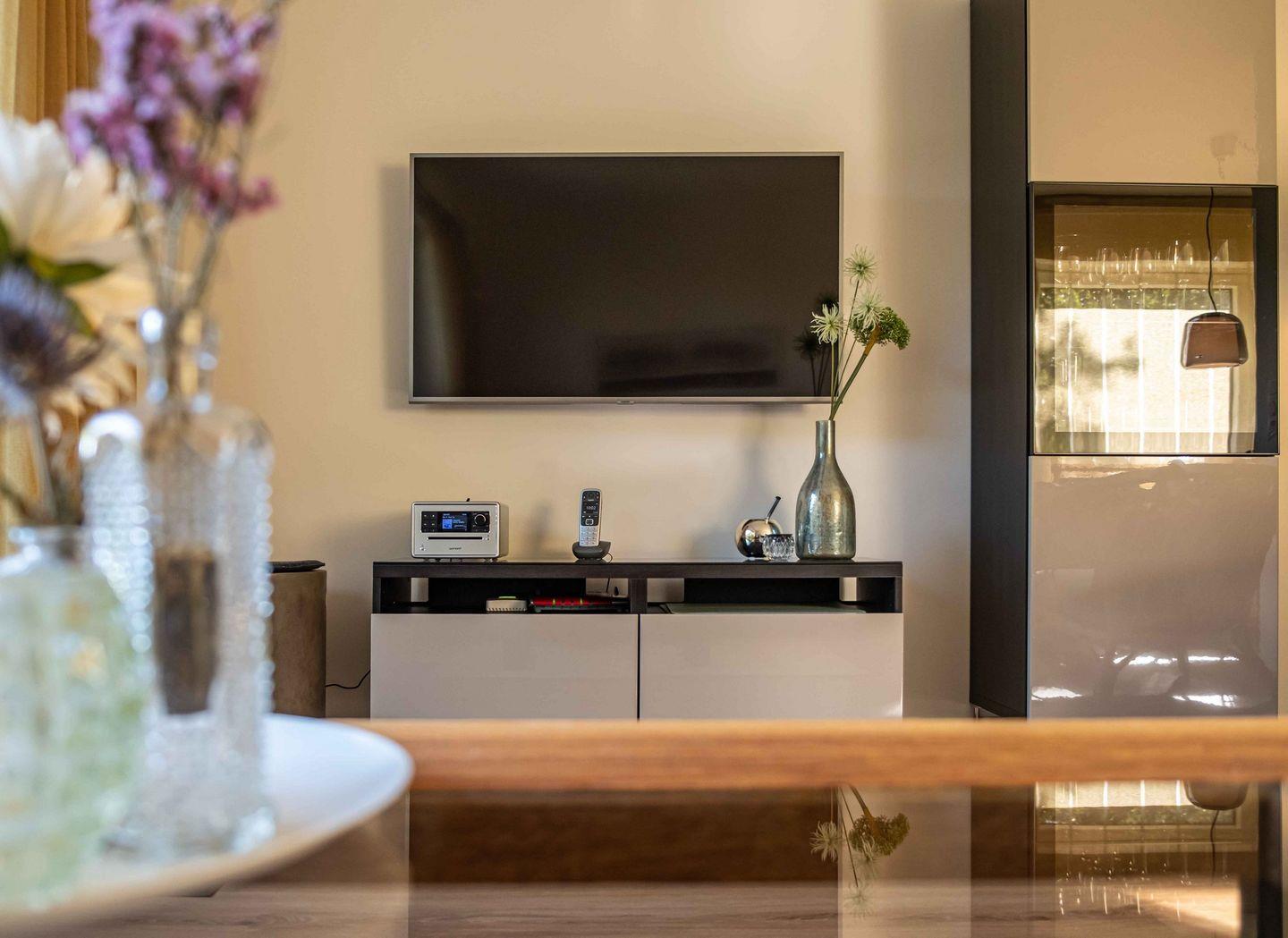 Der liebevoll dekorierte Wohnraum ist mit einer Durchreiche zur separaten Küche verbunden und sorgt mit viel Licht und hellen Farbe für eine wohnliche Atmosphäre. Für die multimediale Unterhaltung sorgen Flachbild-TV mit DVD-Player sowie kostenfreies W-LAN.