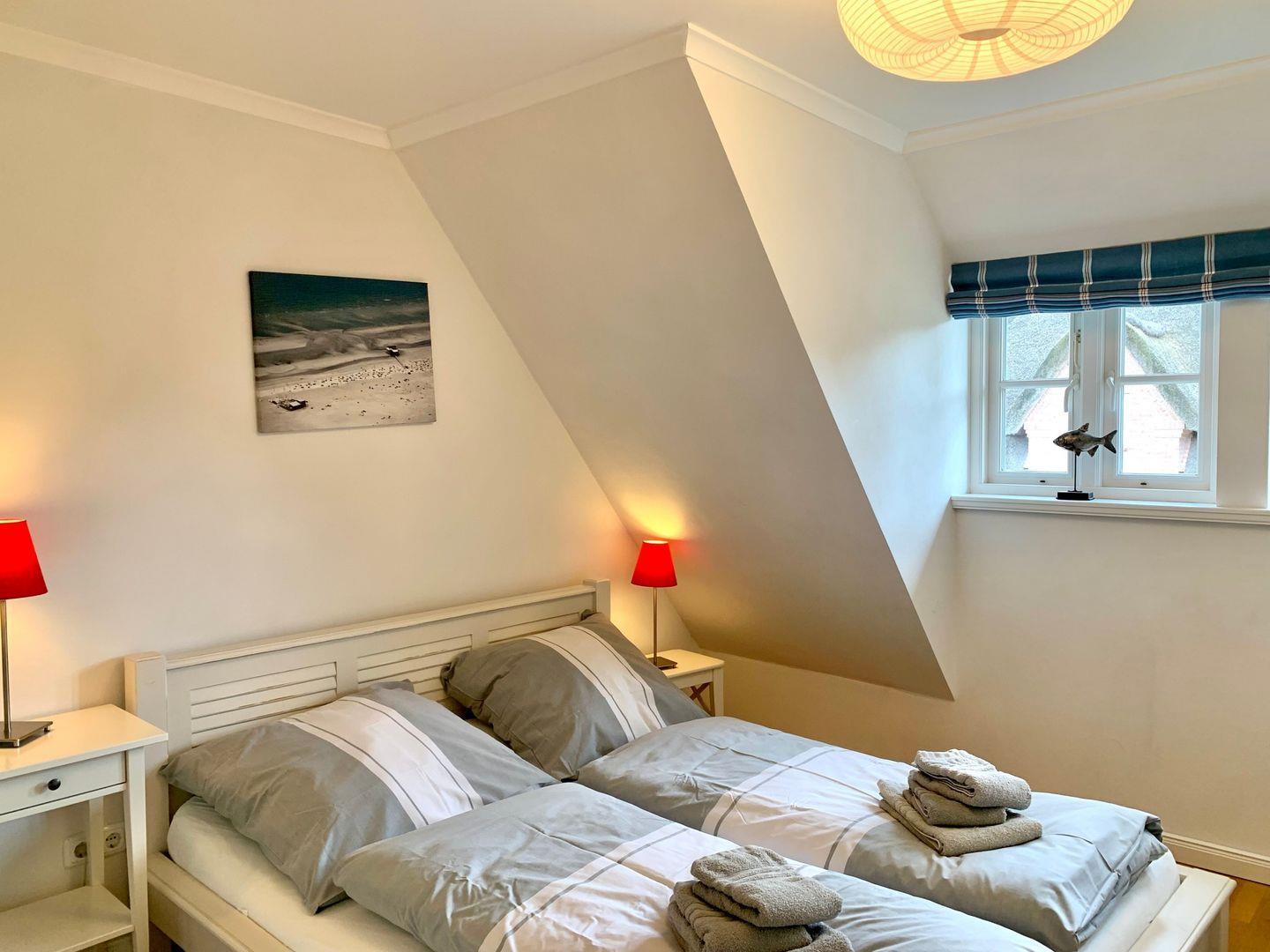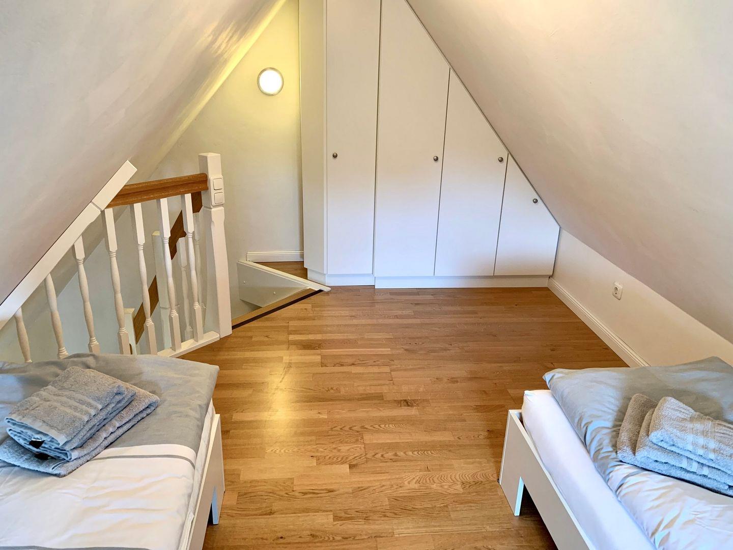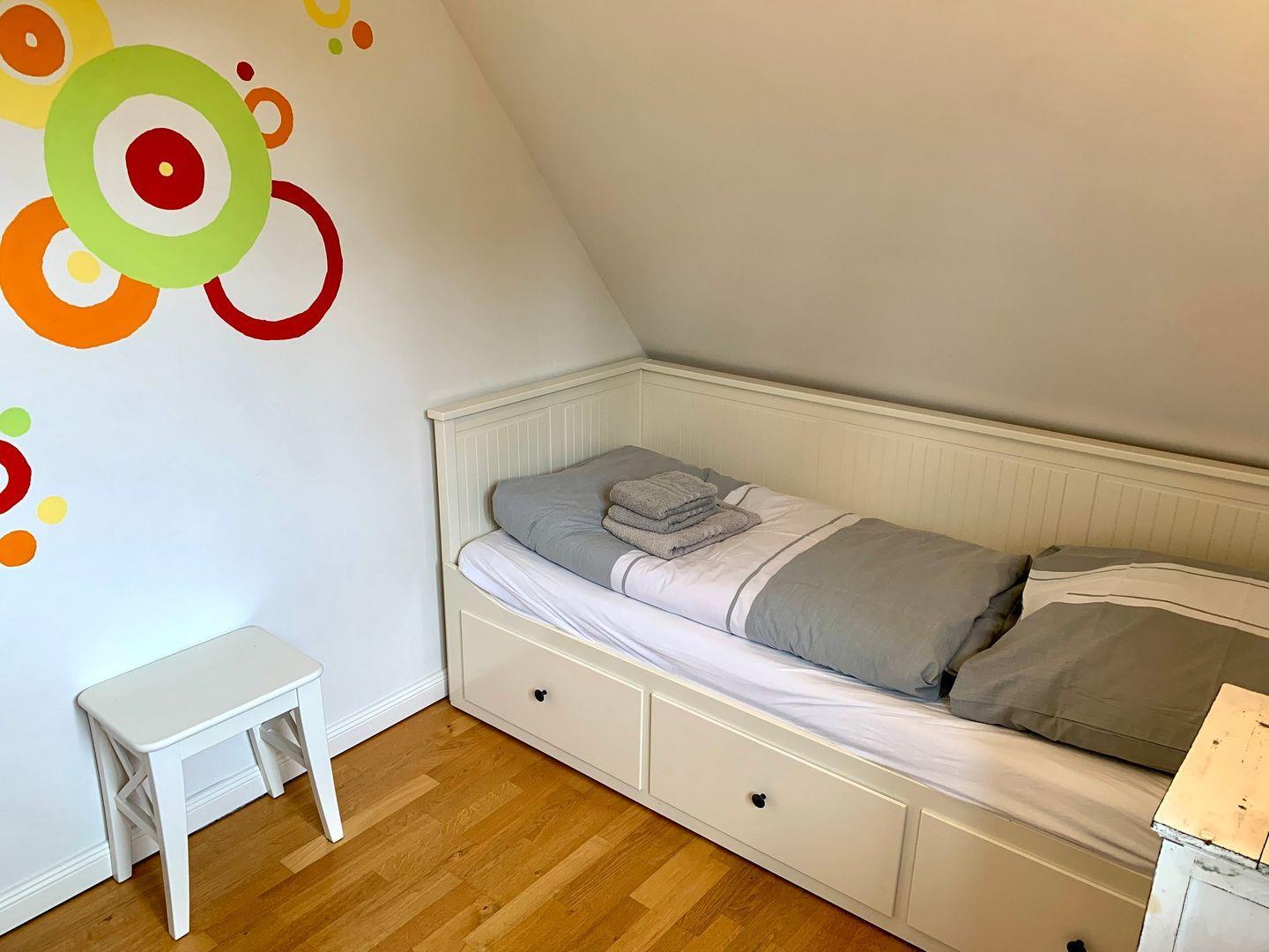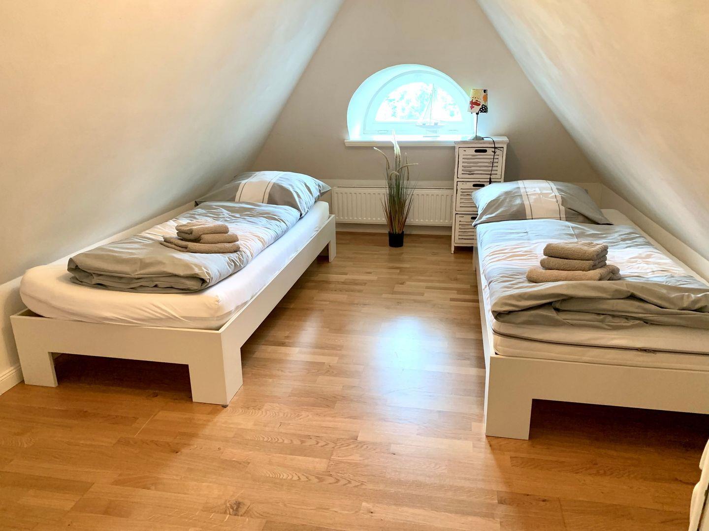 Die 90m² große Doppelhaushälfte bietet bis zu 5 Personen Platz für einen wunderbaren Urlaub in St. Peter Ording. Zwei möblierte Terrassen und ein schöner Garten bieten Sonne, gemütliche Stunden und gemeinsame Mahlzeiten in der typisch norddeutschen Landschaft. Durch die wunderschöne Lage und Ausstattung ist das Ferienhaus wunderbar geeignet für den Urlaub mit der Familie, Kinder sind hier herzlich willkommen. Für erlebnisreiche Tagesausflüge mit Kindern und Familie steht ein Bollerwagen bereit. Der helle, maritim eingerichtet Wohnraum begeistert mit einer urgemütlichen Sofaecke und dem Blick auf den hauseigenen Kaminofen. Hier ist nordische Wohlfühlatmosphäre inklusive. Für die multimediale Unterhaltung sorgen ein großer Flachbild-TV mit DVD-Player, die hauseigene Musikanlage und kostenfreies W-LAN über Glasfaser. Die offene Küche ist sehr gut ausgestattet, Sie verfügt unter anderem über ein Induktionskochfeld samt Backofen sowie Kühlschrank mit Gefrierfach und Geschirrspüler. Im Erdgeschoss ist ebenfalls ein Duschbad mit WC vorhanden. Im separaten Hauswirtschaftsraum stehen Waschmaschine, Wäschetrockner und Bügelzubehör zur Verfügung. In der 1. Etage sind zwei Schlafzimmer eingerichtet, eines ist mit gemütlichem 180x200cm Doppelbett mit Einzelmatratzen und Topper ausgestattet, im zweiten Schlafzimmer sind 2 Einzelbetten vorhanden. Zur 1. Etage gehört weiterhin ein weiteres WC. Das gemütliche Dachgeschoss beherbergt ein weiteres Schlafzimmer, dort sind 2 Einzelbetten untergebracht.