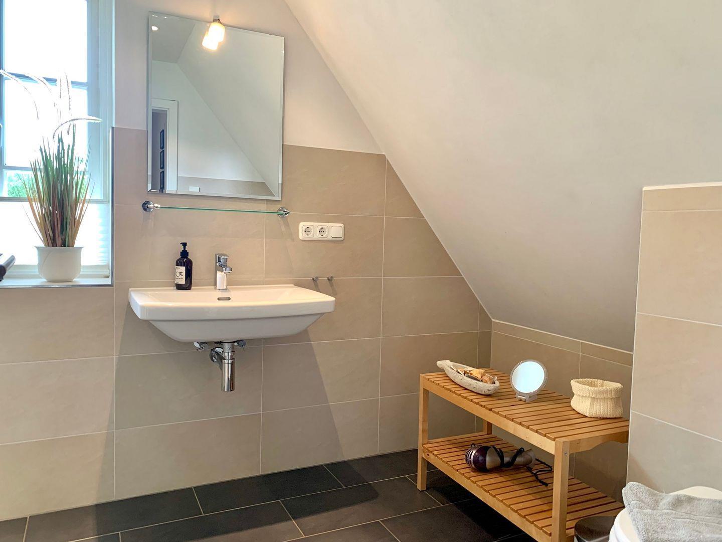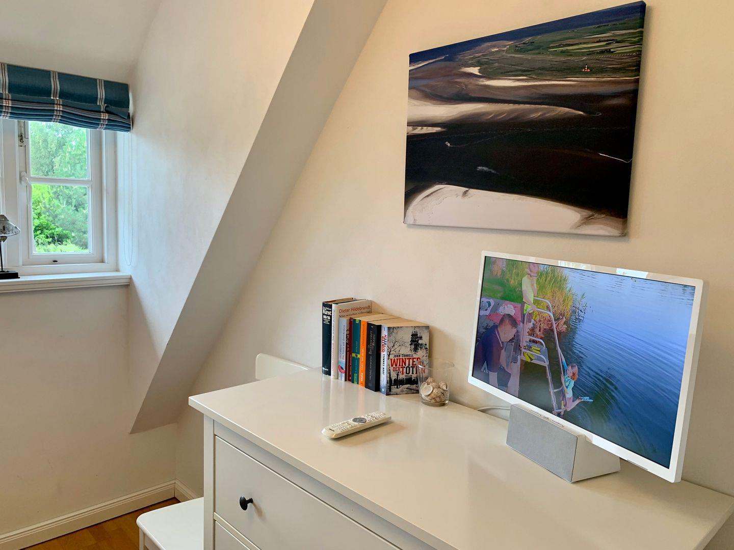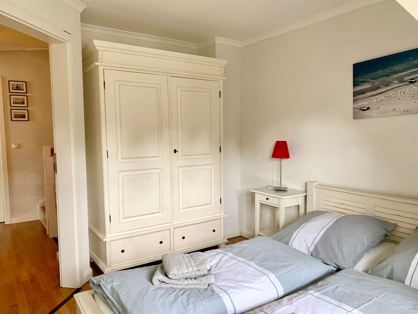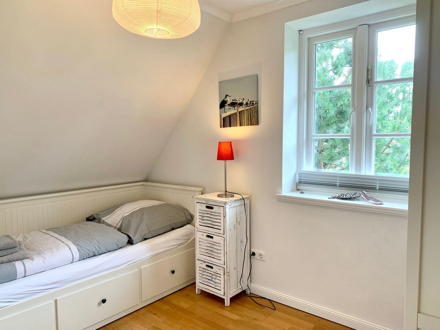 Die 90m² große Doppelhaushälfte bietet bis zu 5 Personen Platz für einen wunderbaren Urlaub in St. Peter Ording. Zwei möblierte Terrassen und ein schöner Garten bieten Sonne, gemütliche Stunden und gemeinsame Mahlzeiten in der typisch norddeutschen Landschaft. Durch die wunderschöne Lage und Ausstattung ist das Ferienhaus wunderbar geeignet für den Urlaub mit der Familie, Kinder sind hier herzlich willkommen. Für erlebnisreiche Tagesausflüge mit Kindern und Familie steht ein Bollerwagen bereit. Der helle, maritim eingerichtet Wohnraum begeistert mit einer urgemütlichen Sofaecke und dem Blick auf den hauseigenen Kaminofen. Hier ist nordische Wohlfühlatmosphäre inklusive. Für die multimediale Unterhaltung sorgen ein großer Flachbild-TV mit DVD-Player, die hauseigene Musikanlage und kostenfreies W-LAN über Glasfaser. Die offene Küche ist sehr gut ausgestattet, Sie verfügt unter anderem über ein Induktionskochfeld samt Backofen sowie Kühlschrank mit Gefrierfach und Geschirrspüler. Im Erdgeschoss ist ebenfalls ein Duschbad mit WC vorhanden. Im separaten Hauswirtschaftsraum stehen Waschmaschine, Wäschetrockner und Bügelzubehör zur Verfügung. In der 1. Etage sind zwei Schlafzimmer eingerichtet, eines ist mit gemütlichem 180x200cm Doppelbett mit Einzelmatratzen und Topper ausgestattet, im zweiten Schlafzimmer sind 2 Einzelbetten vorhanden. Zur 1. Etage gehört weiterhin ein weiteres WC. Das gemütliche Dachgeschoss beherbergt ein weiteres Schlafzimmer, dort sind 2 Einzelbetten untergebracht.