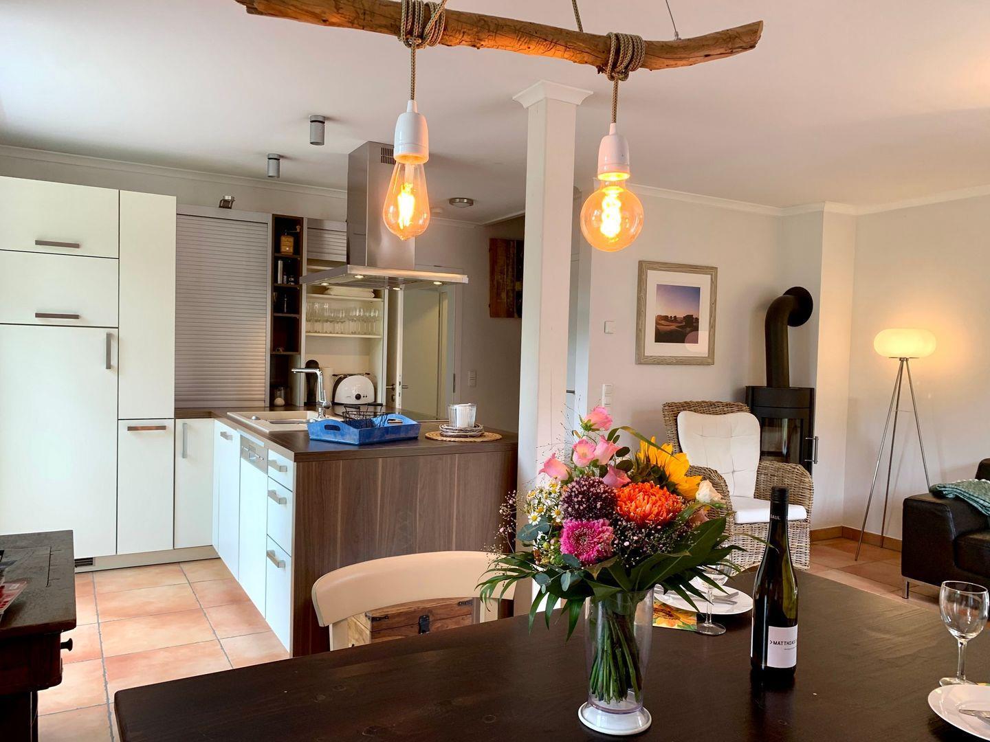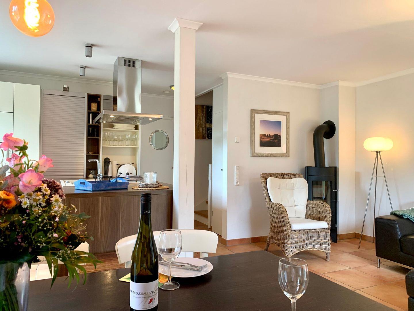 Einladendes Wohnzimmer mit Kaminofen, Esstisch und integrierter Küche mit Küchenblock. Gäste-WC mit Dusche.