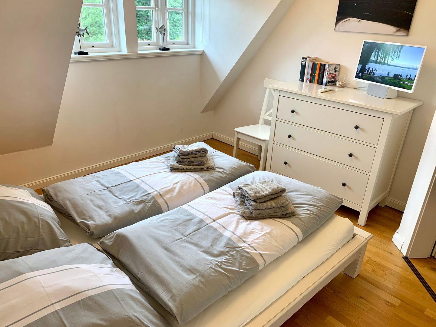 1 Schlafzimmer mit Doppelbett, 1 Schlafzimmer mit Einzelbett 1 Schlafzimmer mit 2 Einzelbetten. Duschbad mit WC.