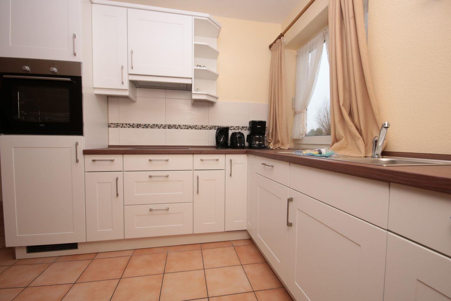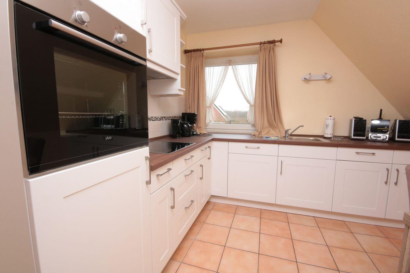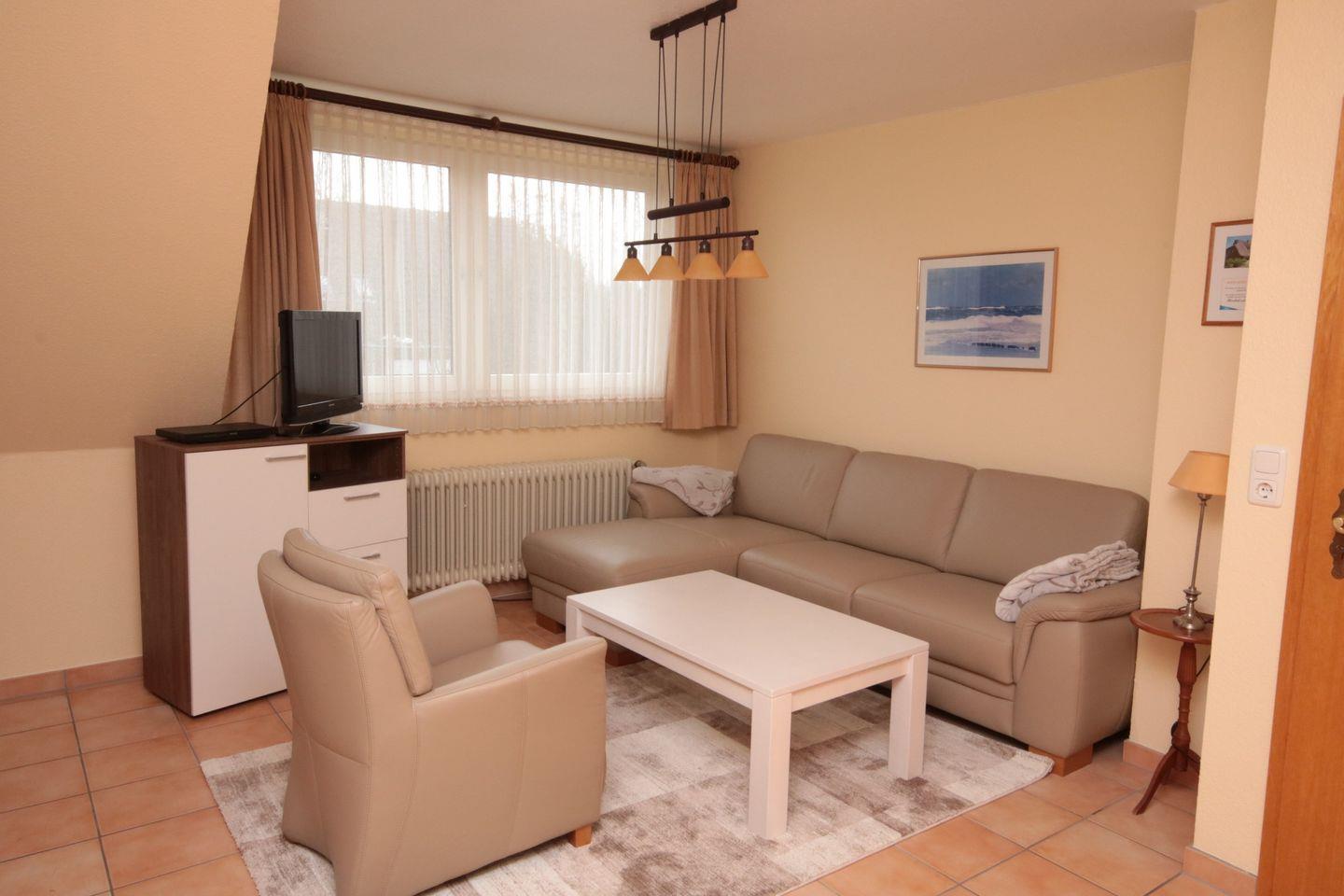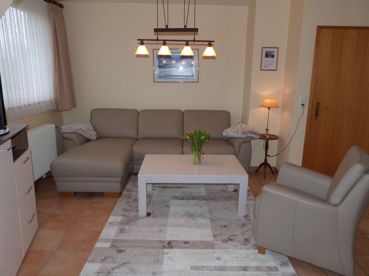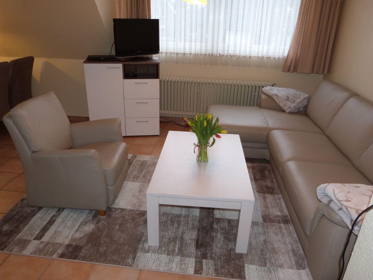 Der große Wohnraum wirkt wunderbar hell und ist eingerichtet mit einer edlen Ledersitzgarnitur sowie Ledersessel. Für die multimediale Unterhaltung sorgen Flachbild-TV mit DVD-Player und Radio.In den Wohnraum integriert liegt die moderne Küchenzeile. Sie ist sehr gut ausgestattet und verfügt unter anderem über Ceranfeld und Backofen, Kühlschrank mit Gefrierfach sowie Kaffeemaschine. Die Ferienwohnung verfügt über 2 separate Schlafzimmer. Eines ist ausgestattet mit großem 180x200cm Doppelbett in edler Optik, das zweite Schlafzimmer verfügt über 2 Einzelbetten aus Naturholz. Die Schlafzimmer sind mit Teppich ausgelegt., Zur Ferienwohnung gehören Duschbad und WC. Perfekt geeignet für den Urlaub mit der Familie, Kinder sind hier herzlich willkommen. Auch Urlaub mit Hund in St. Peter Ording ist hier möglich, bis zu zwei Hunde begleiten die Familie auf Anfrage. W-LAN wird nicht angeboten.