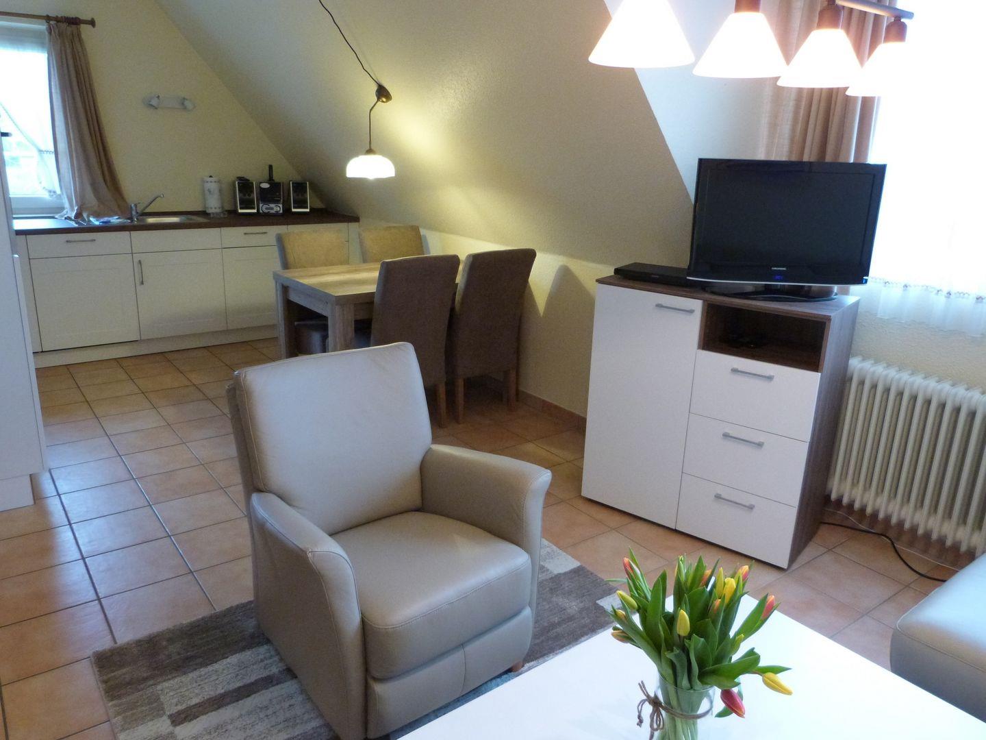 Wohnraum mit Küchenzeile, Duschbad mit WC, Sat-TV, Radio