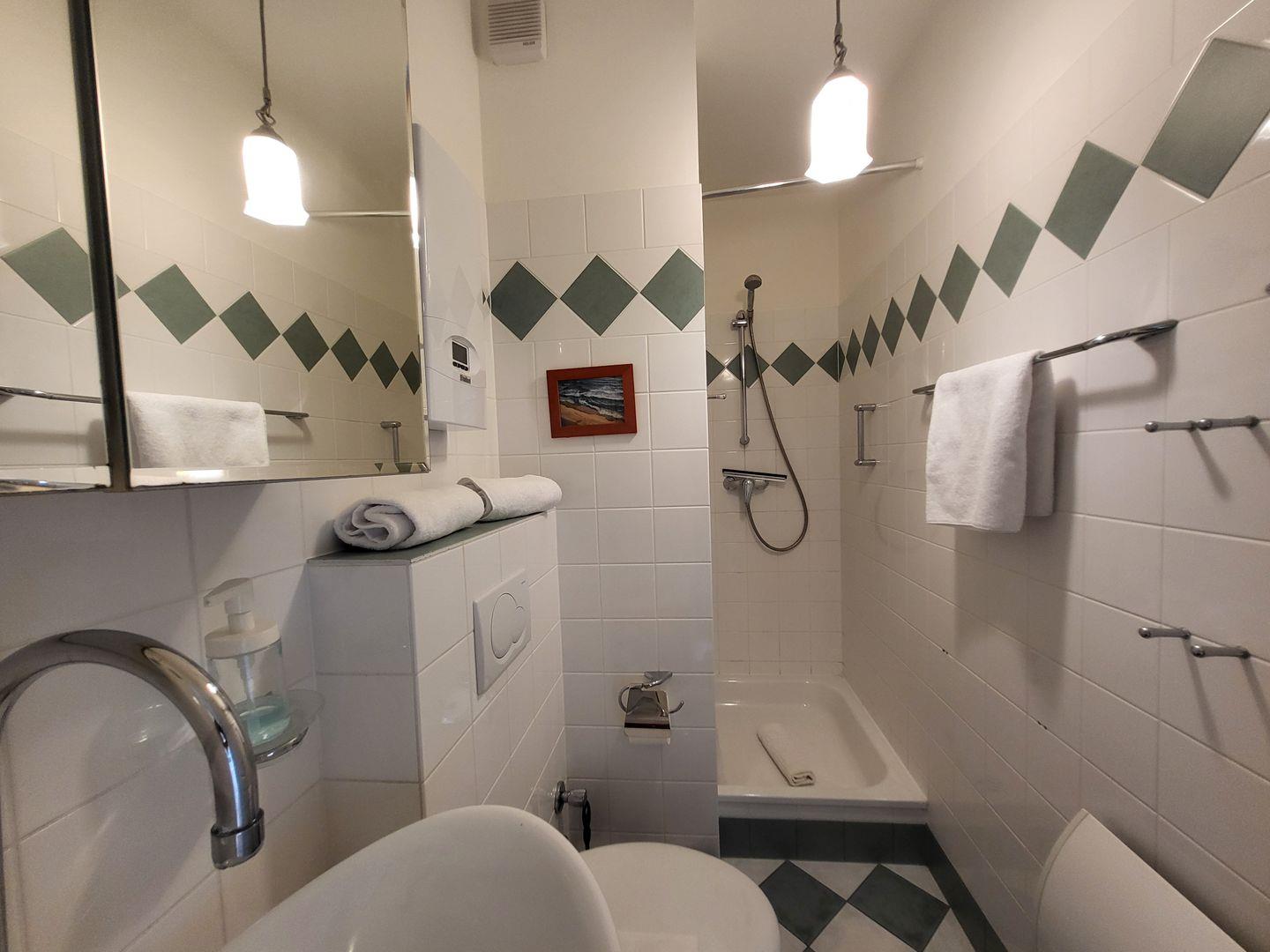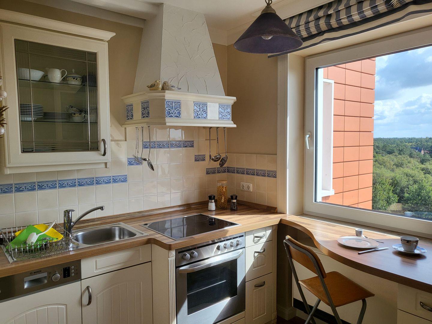 Die angrenzende Küche ist mit einer hochwertigen Küchenzeile versehen, hier gehören unter anderem Cerankochfeld und Backofen sowie Kühlschrank mit Gefrierfach sowie Geschirrspüler und Kaffeemaschine zur Ausstattung. Zur Ferienwohnung gehört ein Duschbad mit WC.