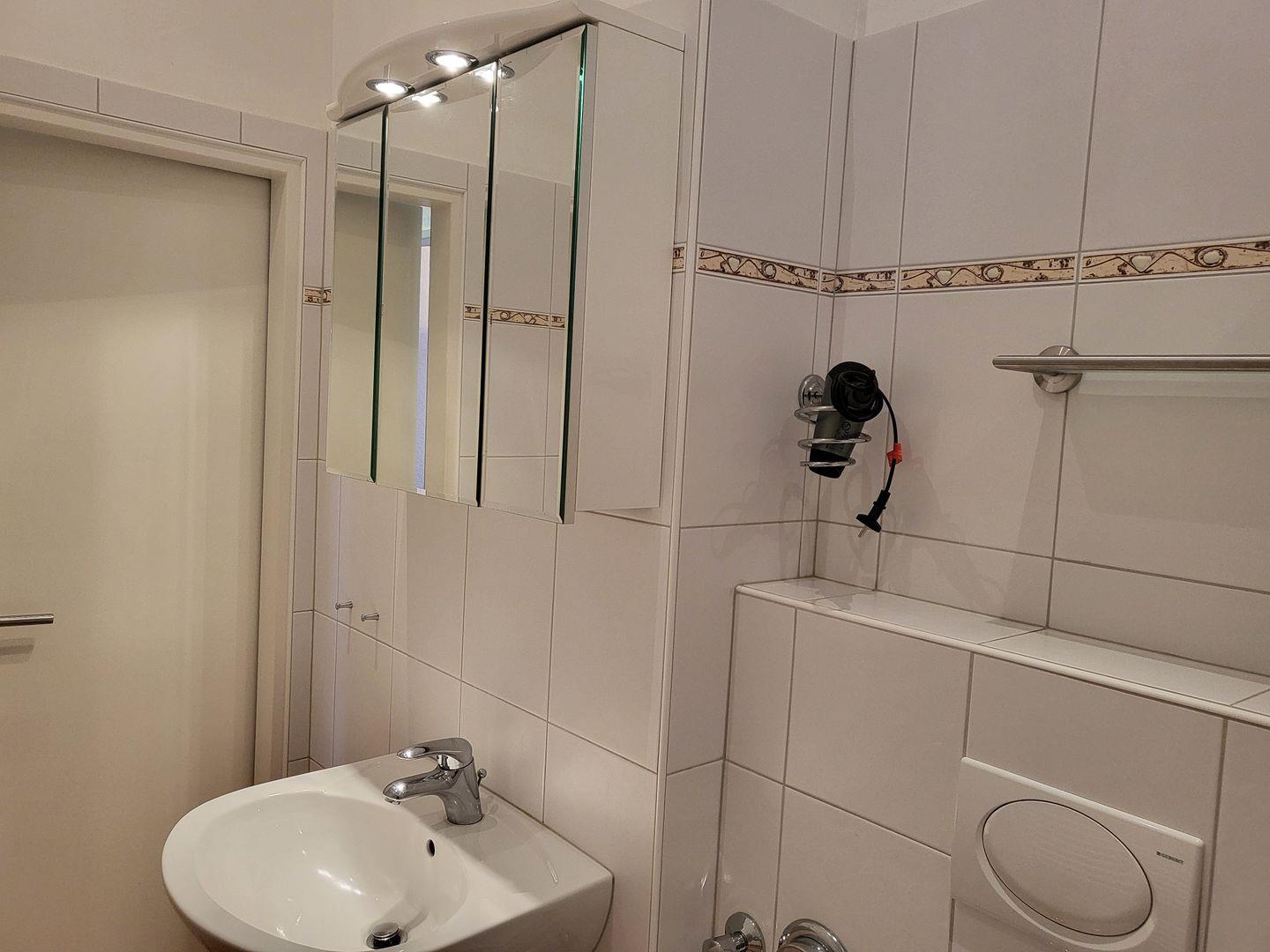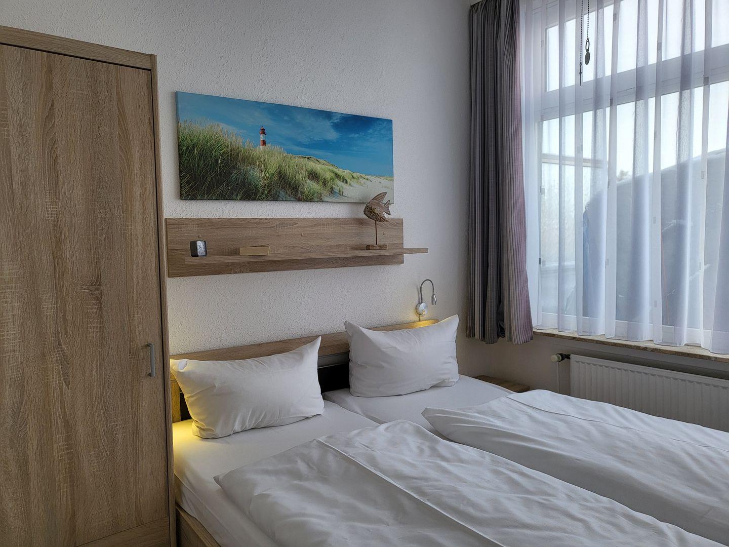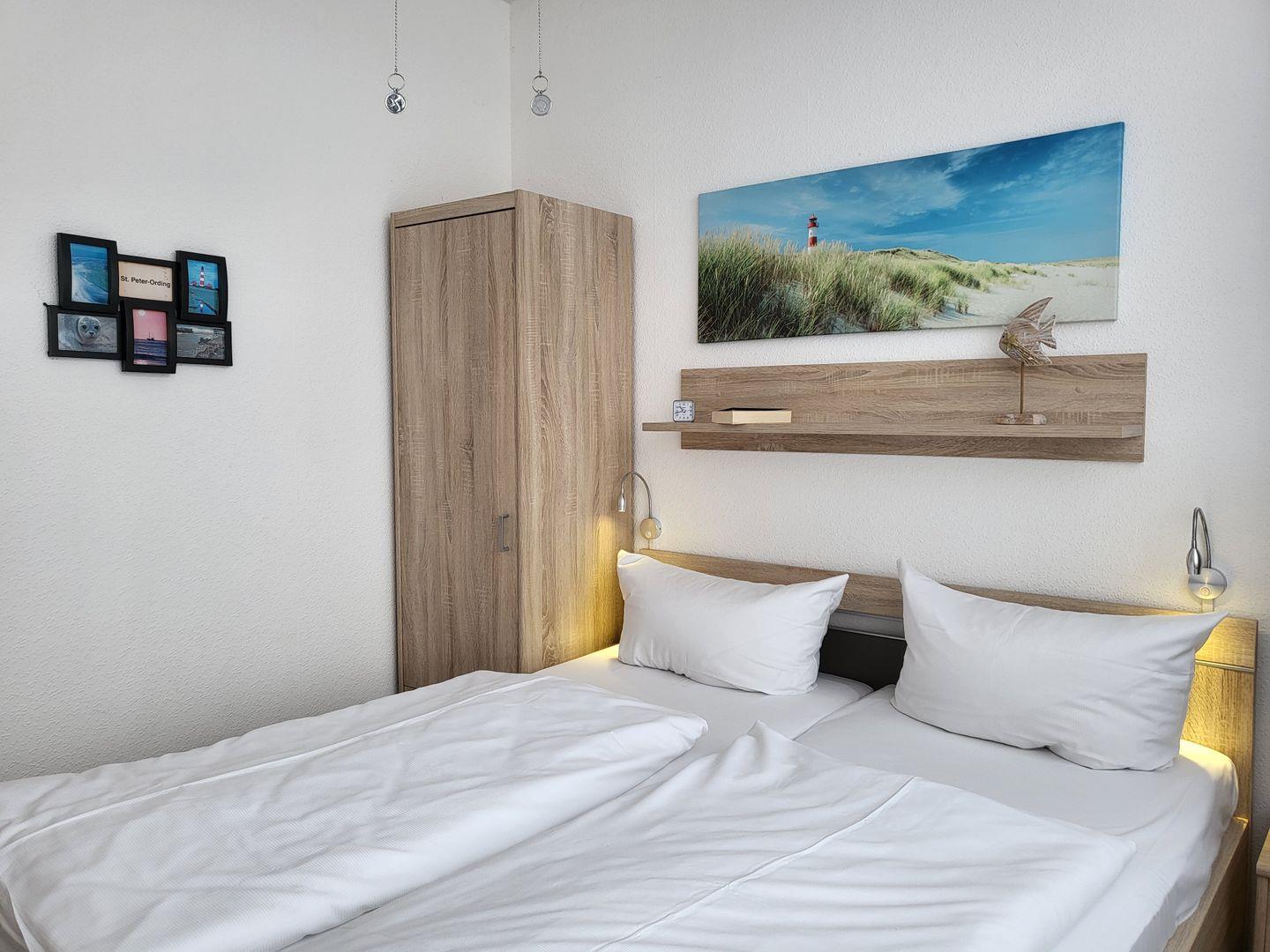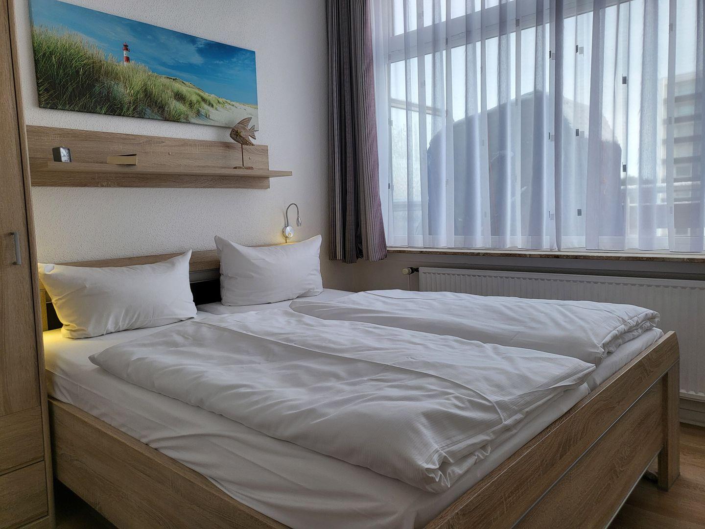 Ein Schlafzimmer mit Doppelbett, Duschbad mit WC, Bettwäsche inklusive, W-LAN, Tiefgarage, Nichtraucher, keine Haustiere.