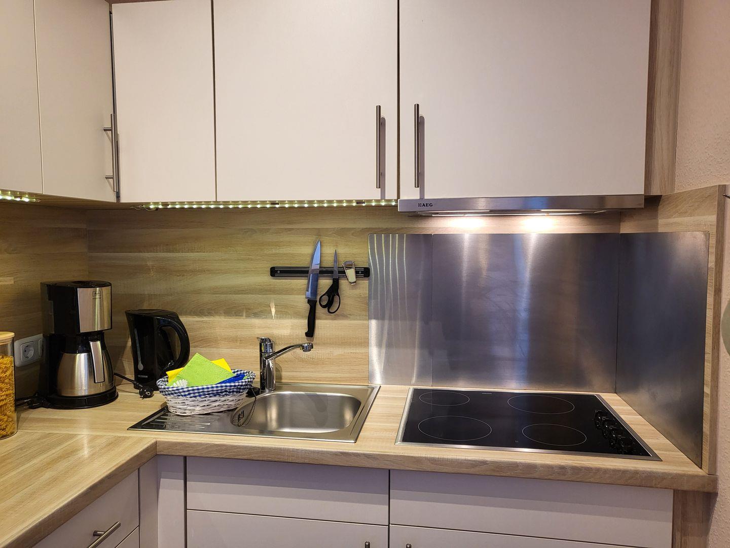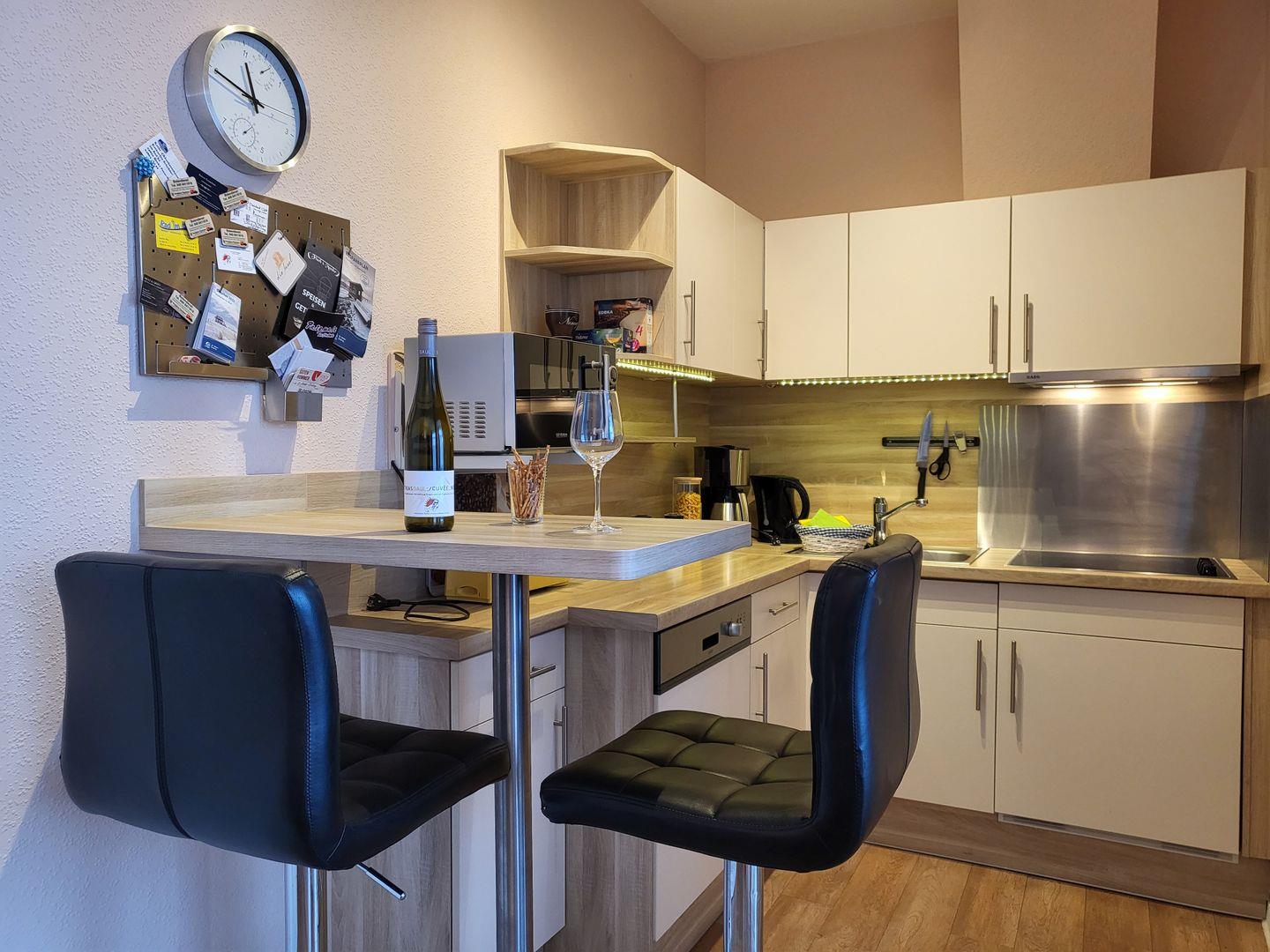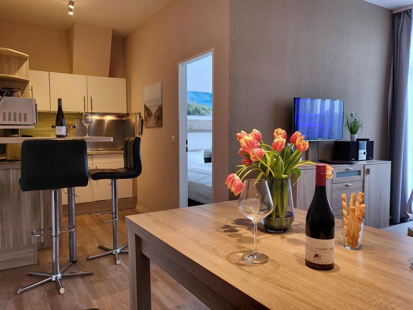 Die angrenzende, offene Küche ist sehr gut ausgestattet. Hier stehen unter anderem Cerankochfeld, Kühlschrank, ein Geschirrspüler sowie Mikrowelle und Kaffeemaschine zur Verfügung. Ein kleiner Tresen mit Sitzgelegenheiten ist ebenfalls vorhanden. Das separate Schlafzimmer des Penthouses ist ausgestattet mit einem komfortablen 160x200cm Doppelbett. Das Badezimmer ist mit einer geräumigen Regendusche und einem WC ausgestattet, Föhn und Handtuchtrockner stehen zur Verfügung. Diese Wohnung kann den Fahrstuhl nutzen.