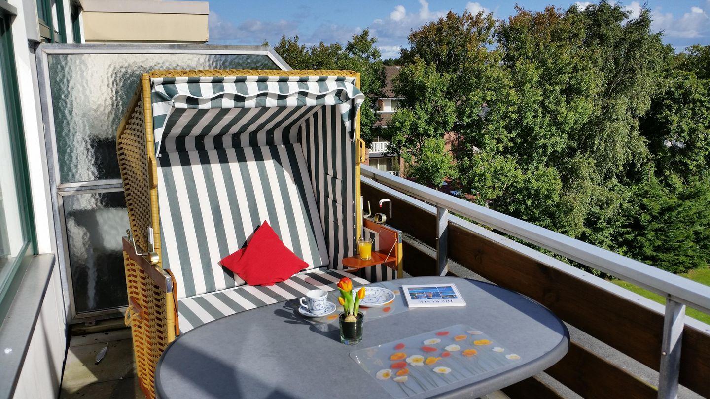Die hell und modern eingerichtete, ca. 40m² große, 2-Zimmer Ferienwohnung für bis zu 3 Personen liegt in der 3. Etage und begeistert mit möbliertem Balkon. Hier steht in der Sommersaison ein typisch norddeutscher Strandkorb zur Verfügung, der entspannte Stunden in der Morgen- und Mittagsonne verspricht. Der Balkon liegt wunderbar ruhig an der windstillen Rückseite des Gebäudes.