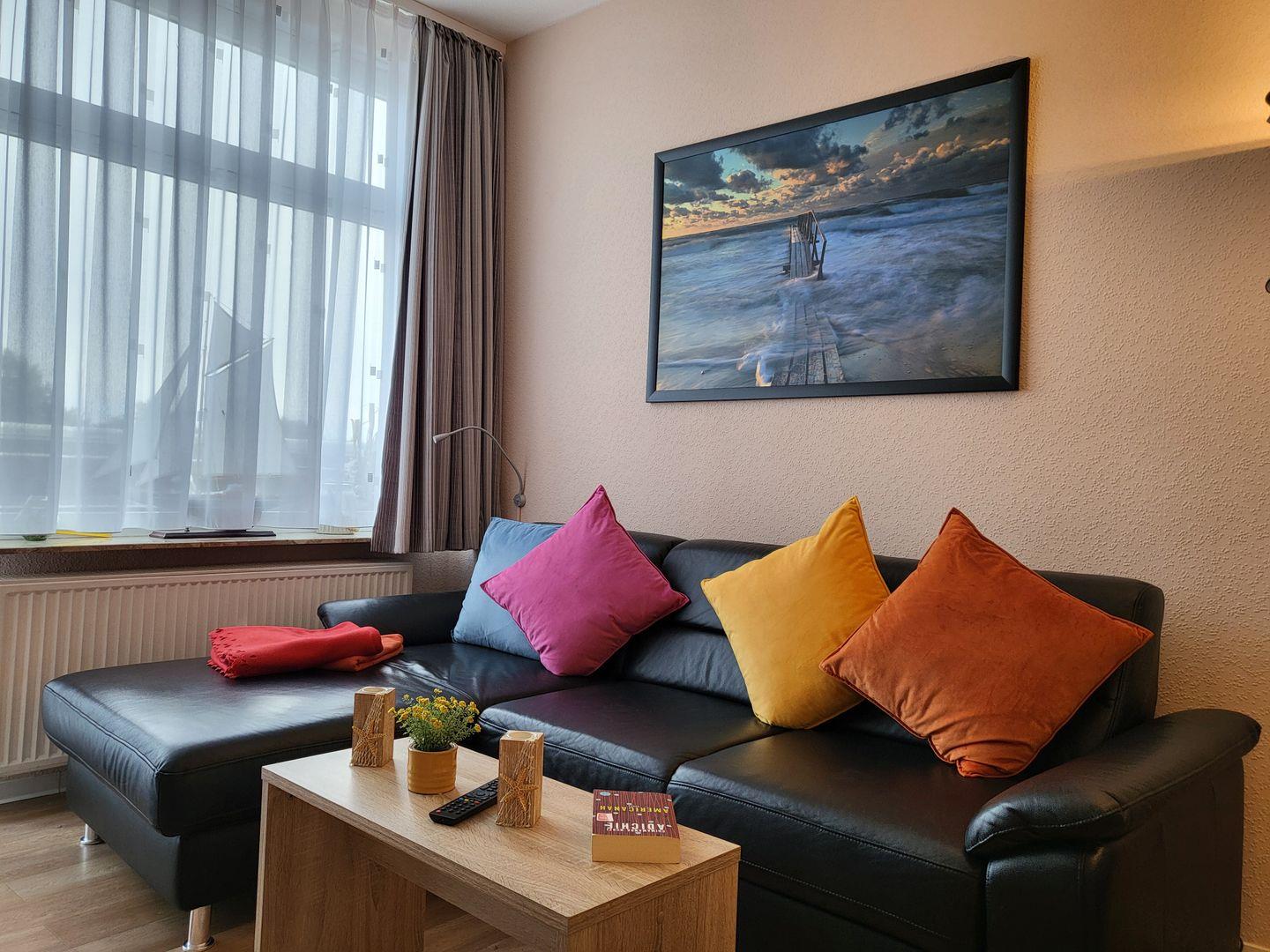Der große Wohnraum ist charmant und einladend in Szene gesetzt. Zur Ausstattung gehören neben dem sehr bequemen Ledersofa, dass sich auch als komfortables Schlafsofa nutzen lässt, ein hochwertiger Flachbild-TV, eine Musikanlage sowie eine gemütliche Ess-Ecke. Kostenfreies W-LAN steht zur Verfügung.