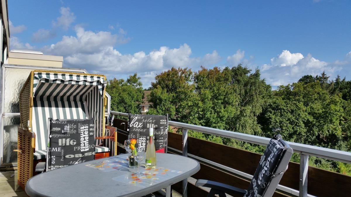 Zentrale 2-Zimmer Penthousewohnung im 3. OG für bis zu 3 Personen. Balkon mit Strandkorb. Wohnraum mit Schlafcouch und intregrierter Küchenzeile.