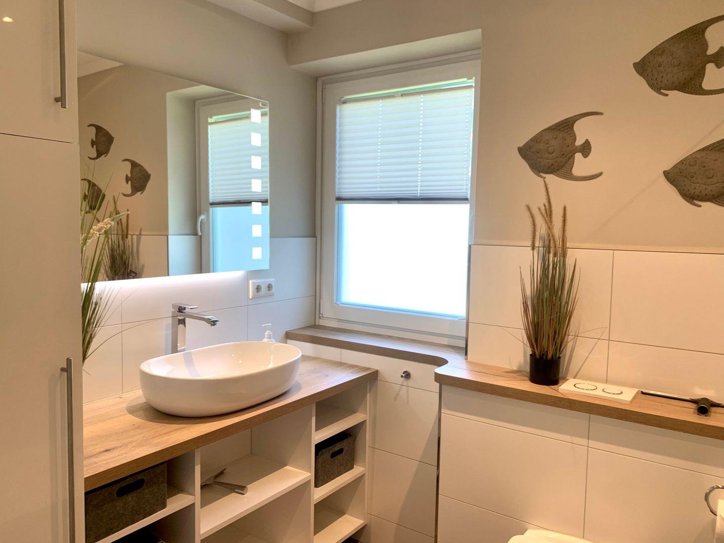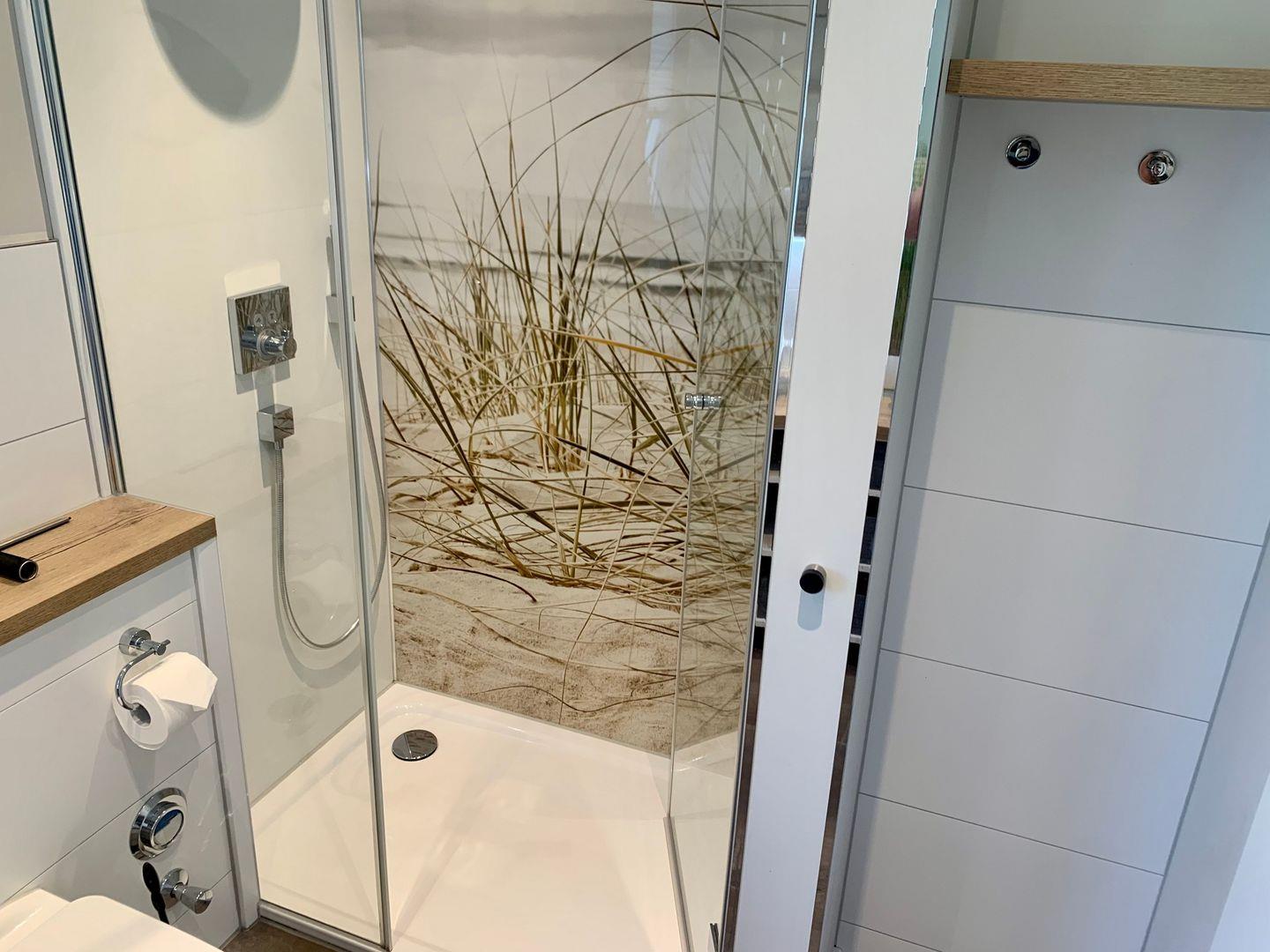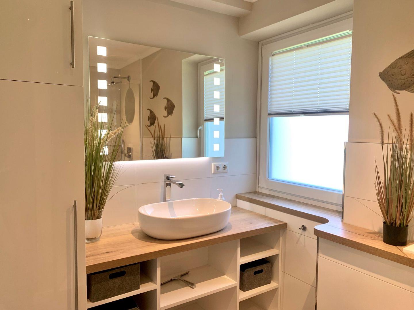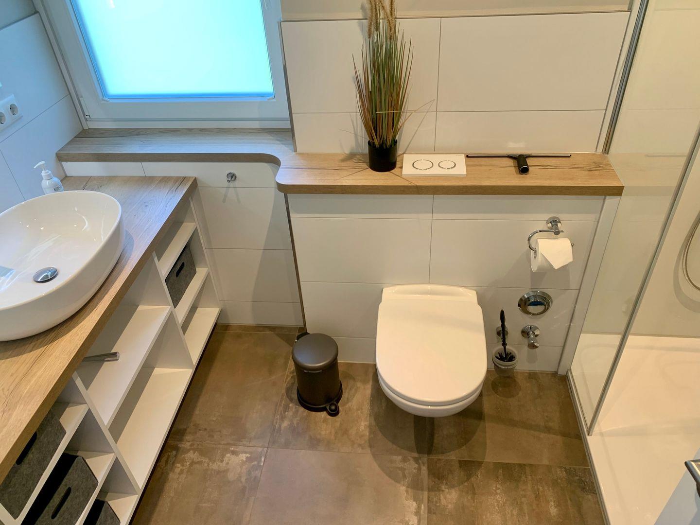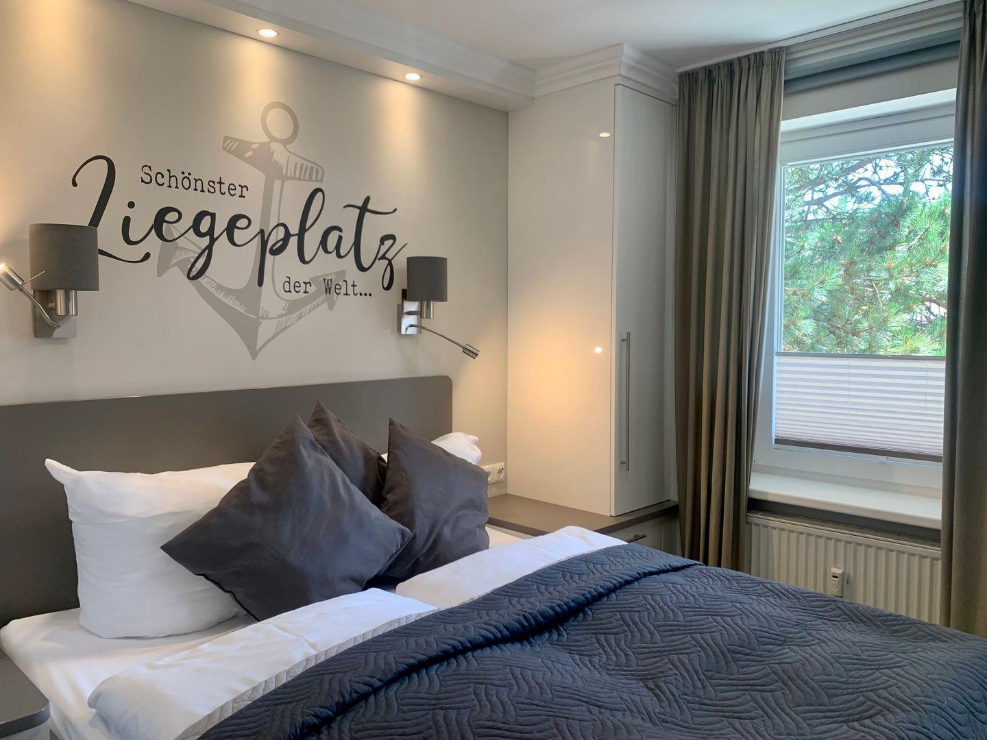 Modern eingerichtet und hell zeigt sich das geräumige Schlafzimmer mit einladendem Boxspringbett. Zur Ferienwohnung gehört ein modernes, gut ausgestattetes Duschbad mit WC.