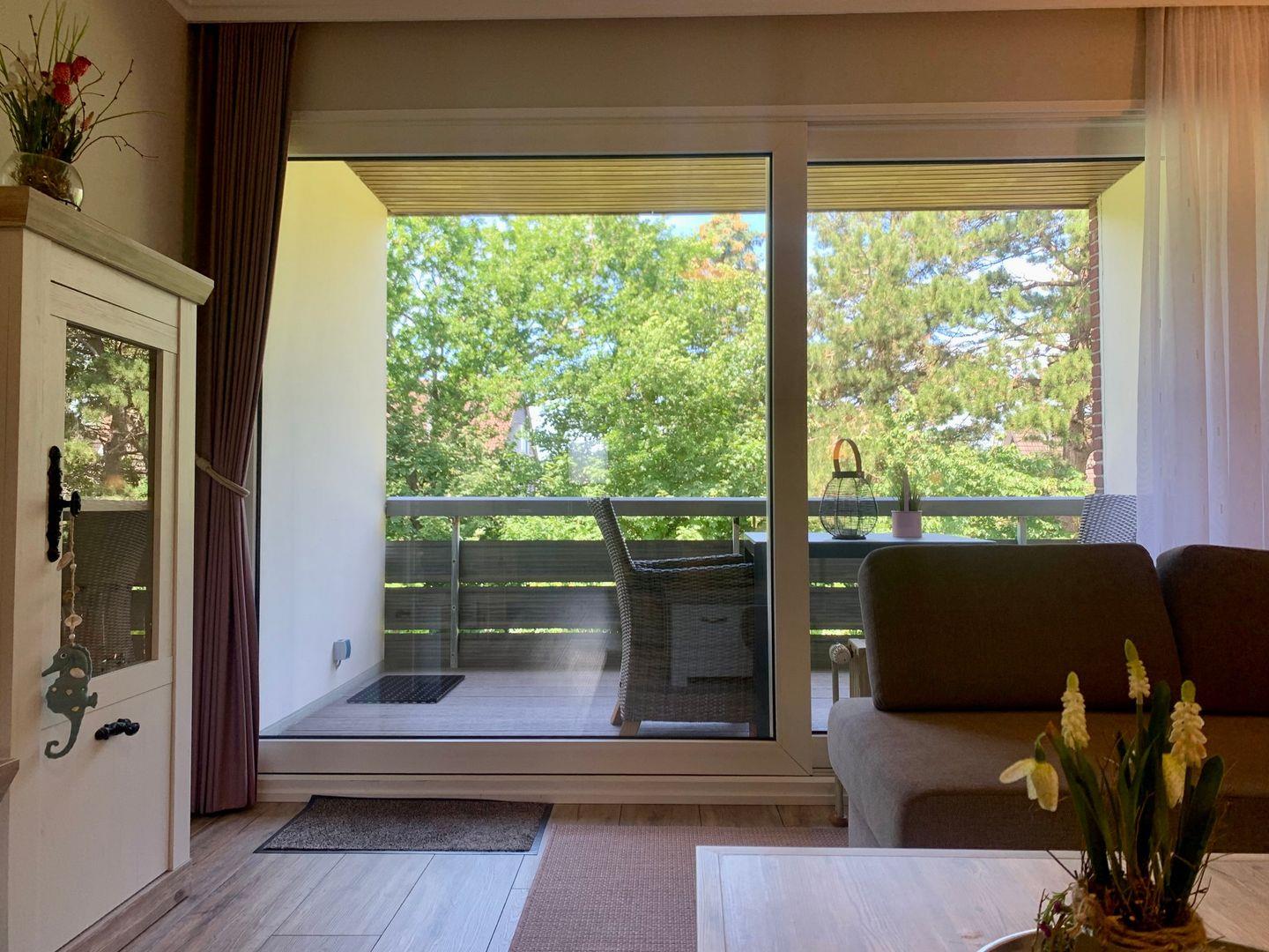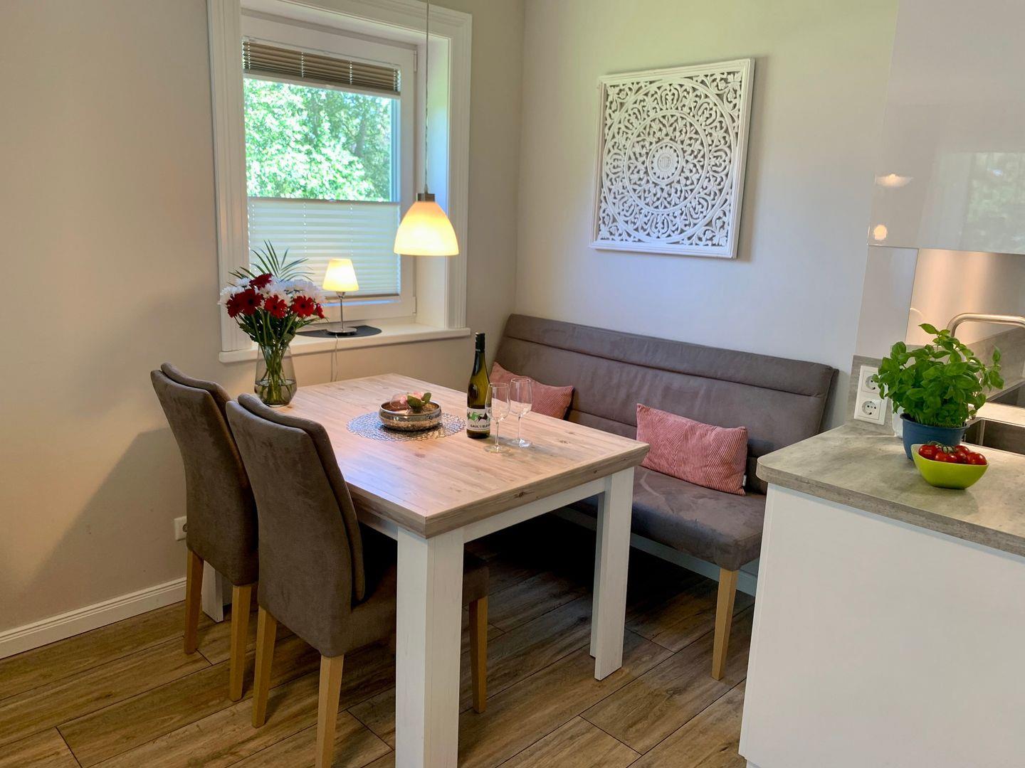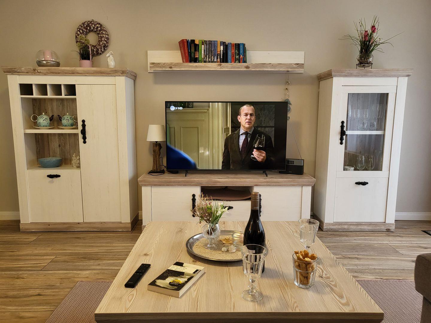 Durch den Übergang zum Balkon wirkt das modern und liebevoll eingerichtete Wohnzimmer wunderbar hell und einladend. Eine gemütliche Sitzgarnitur fügt sich nahtlose in den harmonischen Stil ein. Die gemütliche Essecke bietet Platz für genüssliche Mahlzeiten, für die multimediale Unterhaltung sorgen ein großer Smart-TV und kostenfreies W-LAN.