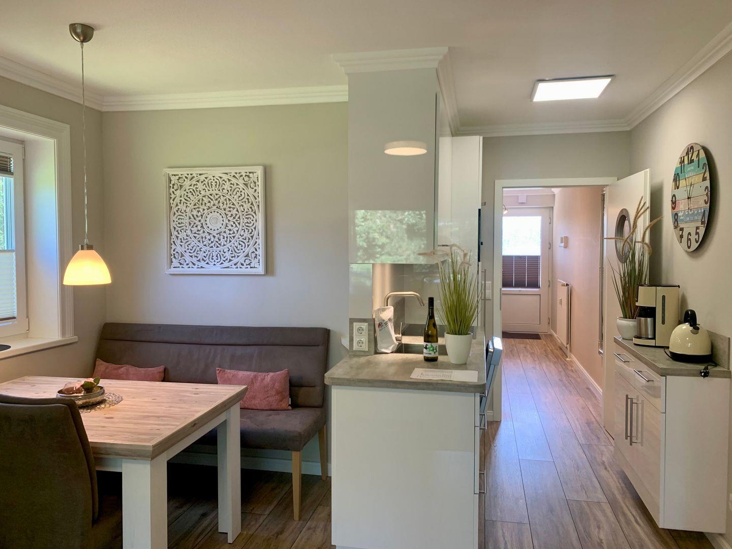 Die offene, sehr moderne Küchenzeile verfügt unter anderem über Mikrowelle mit Grillfunktion, ein großer Kühlschrank mit Gefrierfach sowie Kaffeemaschine und Geschirrspüler.