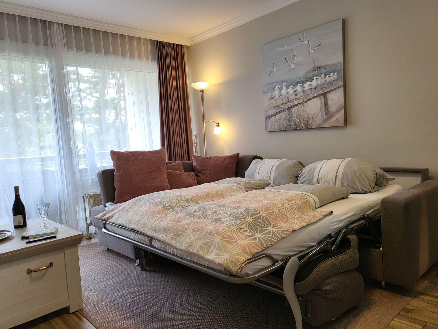 1 Schlafzimmer mit Boxspringbett, Flur mit Garderobe, Duschbad mit WC, Wohnraum mit Schlafsofa und Küchenzeile inkl. Schlafsofa.