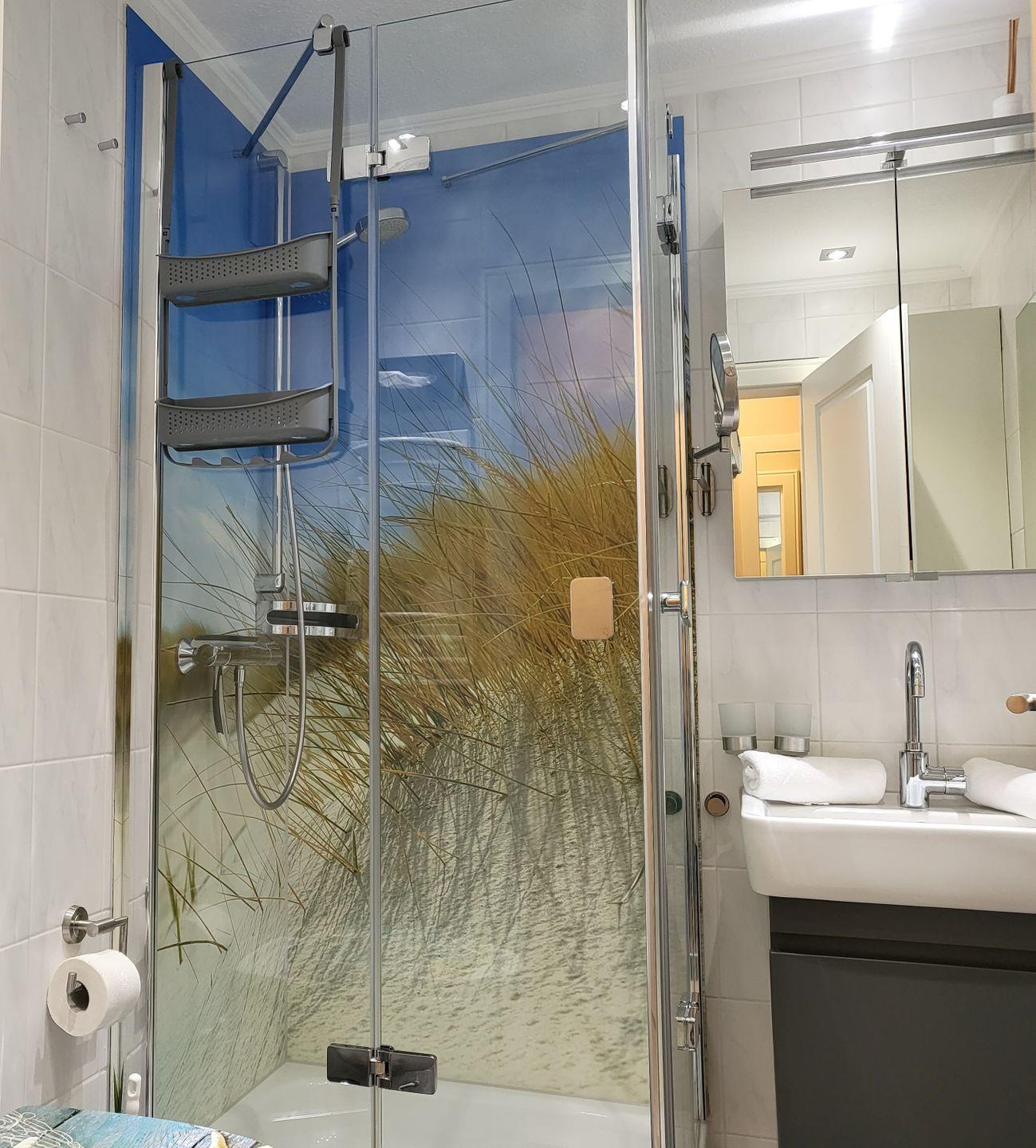 Kompakt, modern und gut ausgestattet präsentiert sich die Küchenzeile der Ferienwohnung. Zur Ausstattung gehören neben einem kompakten Kochfeld unter anderem ein Kühlschrank mit Gefrierfach, ein Mikrowellenofen sowie Toaster, Kaffeemaschine und einen Geschirrspüler. Außerdem gibt es eine Espresso-Maschine von Caffisimo. Kapseln hierfür müssen selber mitgebracht werden.