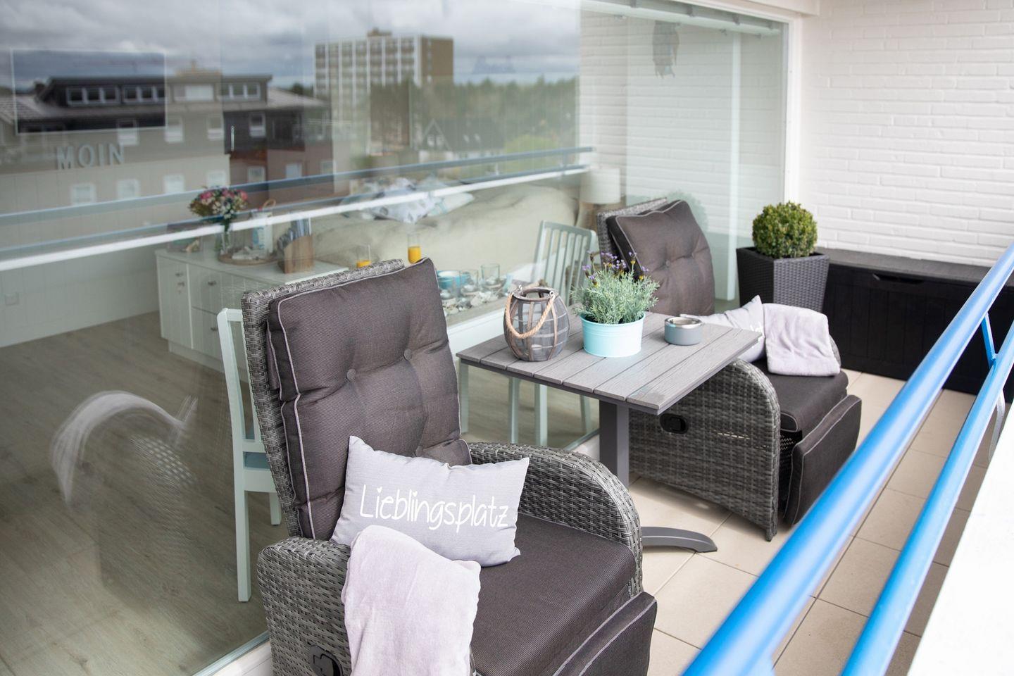 Fest zum Programm der liebevoll und maritim eingerichteten Ferienwohnung gehört der komplett möblierte Südbalkon mit seitlichem Blick bis hin zu Pfahlbauten, Strand und Meer.
