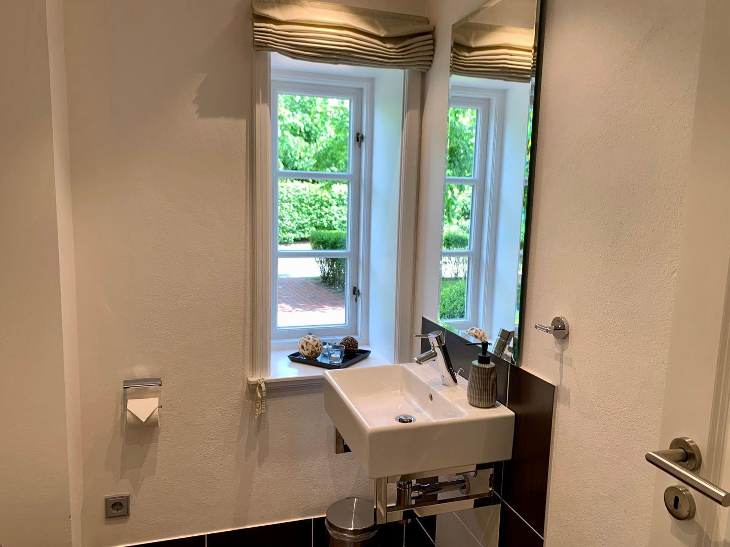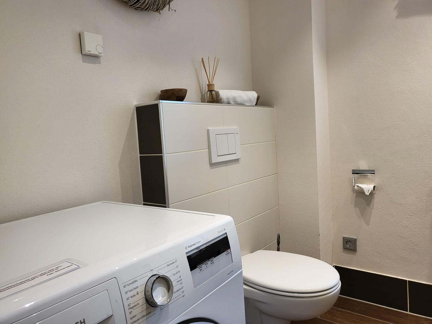 Zum Erdgeschoss gehört weiterhin ein Gäste-WC.Auch eine eigene Waschmaschine ist in der Wohnung vorhanden. Zum Obergeschoss gehören zwei großzügige Schlafzimmer mit 180x200cm Doppelbetten.