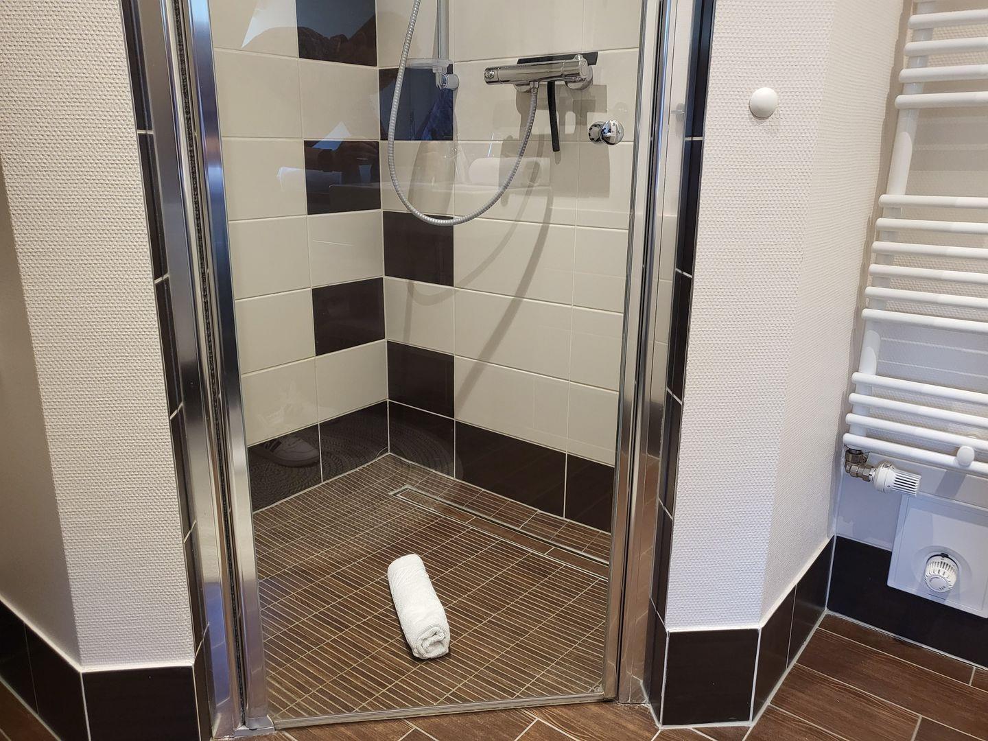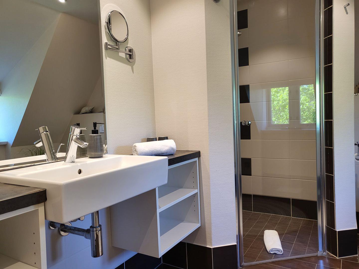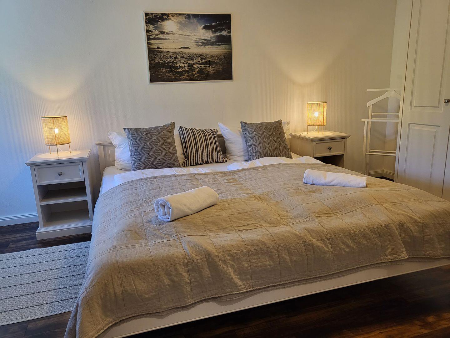 Im Obergeschoss zwei Schlafzimmer mit großen Doppelbetten sowie 2 Duschbäder mit bodengleichen Duschen.