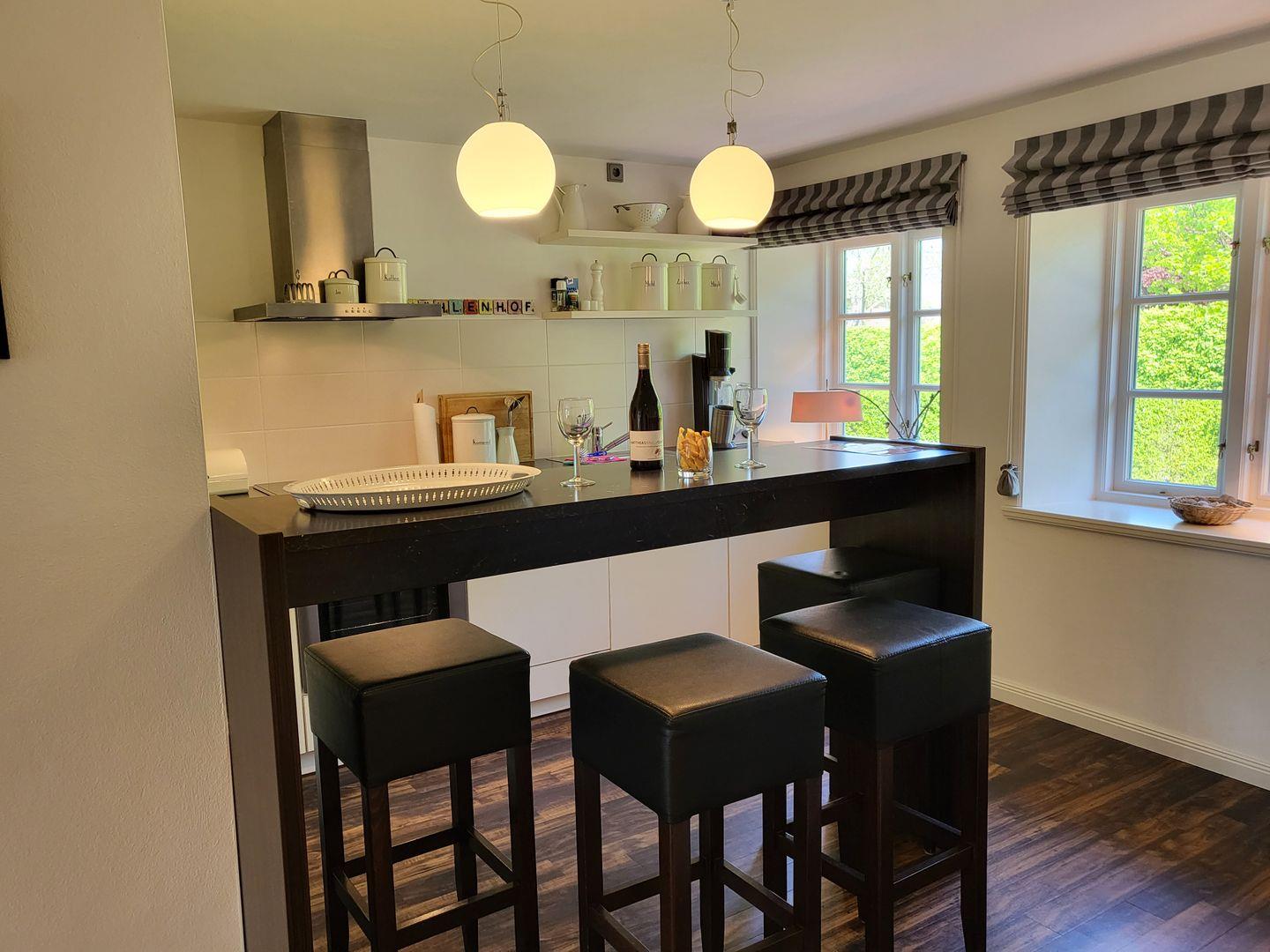 In den Raum integriert liegt die sehr gut ausgestattete Küche, dort gehören unter anderem Cerankochfeld und Herd, ein Kühlschrank mit Geschirrspüler sowie Mikrowelle und eine Kaffeemaschine.